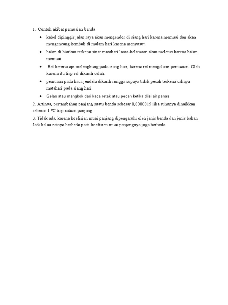 Volume yaitu bentuk lain dari panjang dalam 3 dimensi karena itu buat menentukan koefisien muai volume sama dengan 3 kali koefisien muai panjang. Coba amati kabel listrik yang terlihat lebih kendor di siang hari jika dibanding pada pagi hari itulah contoh dari muai pemuaian panjang. Pemuaian banyak sekali manfaatnya bagi kehidupan manusia yang kadang kala tidak kita sadari. Apenyusutan pada benda padat salah satu penyusutan pada benda padat adalah keadaan kabel telepon pada pagi hari jika dibandingkan dengan siang hari. 10 contoh pemuaian dalam kehidupan sehari hari apa sajakah itu. Perubahan panjang akibat panas ini sebagai contoh akan mengikuti.