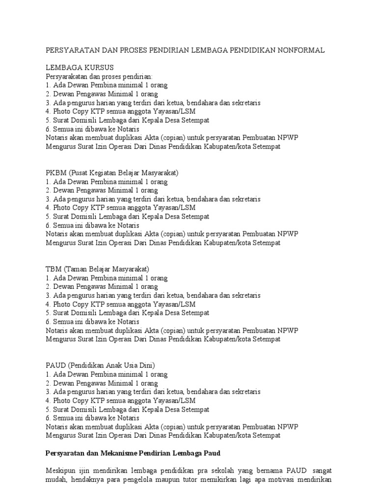 Lembaga kursus dan pelatihan adalah salah satu bentuk satuan pendidikan nonformal yang diselenggarakan bagi masyarakat yang memerlukan bekal pengetahuan keterampilan kecakapan hidup dan sikap untuk mengembangkan diri mengembangkan profesi bekerja usaha mandiri danatau melanjutkan pendidikan ke jenjang yang lebih tinggi. Lembaga pendidikan memiliki akta notaris dan ijin dinas pendidikan lembaga tunggal. Agan tolong contoh akta pendirian klinik 23 oktober 2019 2320 posting komentar. Sosialisasi uji kompetensi pengelola lembaga kursus dan pelatihan plkp di ciamis desember 2014. Mengenai pendidikan non formal ini dijelaskan dalam uu no 20 th 2003 tentang sistem pendidikan nasional pasal 26 ayat 4 satuan pendidikan non formal terdiri atas lembaga kursus lembaga pelatihan kelompok belajar pusat kegiatan belajar masyarakat dan majelis taklim serta satuan pendidikan yang sejenis ayat 5 kursus dan pelatihan diselenggarakan bagi masyarakat yang memerlukan bekal. Karena pada dasarnya mendirikan lembaga pendidikan yang dikelola oleh swasta maupun negri baik itu berupa sekolah tinggi sekolah kejuruan balai pelatihan maupun kursus kursus sama seperti mendirikan badan usaha atau badan hukum lainnya yaitu akan didirikan oleh perorangan saja ataukah akan perpartner dengan membentuk cv yayasan maupun pt.