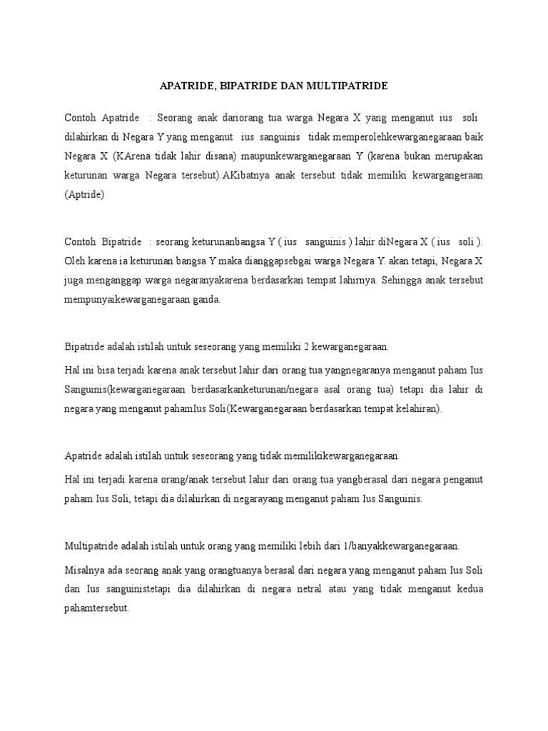 Contoh apatride dan bipatride. Tugas pendidikan pancasila dan kewarganegaraan apatride bipatride dan multipatride dosen pengampu. Apatride berasal dari kata a artinya tidak dan patride artinya kewarganegaraan. Asas ini lebih sesuai dengan kondisi global saat ini di mana status kebangsaan dan kewarga negaraan seseorang tidak ditentukan oleh dasar etnis ras atau agama. Untuk memahami masalah kewarganegaraan maka perlujuga dikaji tentang dua asas kewarganegaraan yaitu asas ius soli dan iussanguinus. Apatride adalah tanpa kewarganegaraan yang rimbul apabvila penurut peraturan kewarganegaraan seseorang tidak diakui sebagai warga negara dari negara manapun. Seorang keturunanbangsa y ius sanguinis lahir dinegara x ius soli.