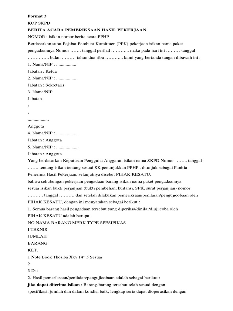 Berita acara serah terima pekerjaan tersebut menjadi dasar bagi penyedia untuk dapat melakukanmengajukan penagihan atas pekerjaan tersebut kepada kementrianlembagasatuan kerja perangkat daerahinstansi yang bersangkutan sedangkan bagi ppk berita acara tersebut sebagai dasar untuk melaporkan penyelesaian pekerjaan pengadaan barang dan jasa serta menyerahkan hasil pekerjaan pengadaan barang. Contoh berita acara klarifikasi dan negosiasi. 10000000000 seratus juta rupiah. 21 pelaksanaan pelayanan pengadaan barang dan jasa. Untuk itulah sebuah perusahaan atau instansi memiliki banyak karyawan dan pegawai yakni menjalankan pekerjaan sesuai dengan tugasnya masing masing. Baik itu menyangkut rapat kehilangan kerusakan serah terima barang peristiwa penyelesaian pekerjaan perubahan status dan masih banyak lagi lainnya.