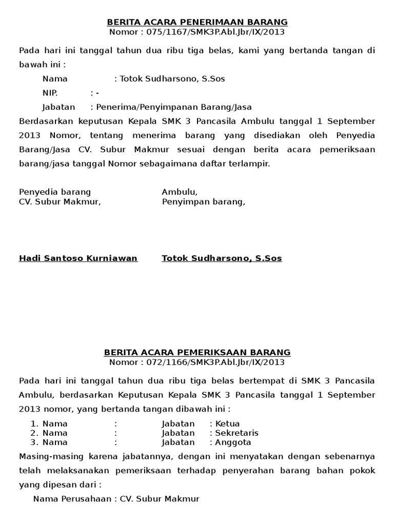 Contoh berita acara penerimaan barang. Berita acara serah terima barang bertujuan sebagai bukti penyerahanpenerimaan sebuah barang bilamana dikemudian hari terdapat kekeliruan. Bappedaxii2011 pada hari ini kamis tanggal delapan bulan desember tahun dua ribu sebelas bertempat di andoolo kabupaten konawe selatan kami yang bertanda tangan dibawah ini. Demikianlah berita acara serah terima barang ini diadakan oleh masing masing belah pihak adapun barang barang tersebut dalam kondisi normal dan baik semenjak penandatanganan berita acara ini dengan begitu barang tersebut sudah menjadi tanggung jawab pihak kedua memelihara merawat dengan baik dan dipakai untuk kebutuhan tempat dimana barang itu dibutuhkan. Dan berkesimpulan bahwa. Berita acara serah terima barang berfungsi untuk mencegah terjadinya kecurangan mencegah terjadinya minus dalam pengelolaan stock barang serta menjadikan. Berita acara penerimaan barang nomor.