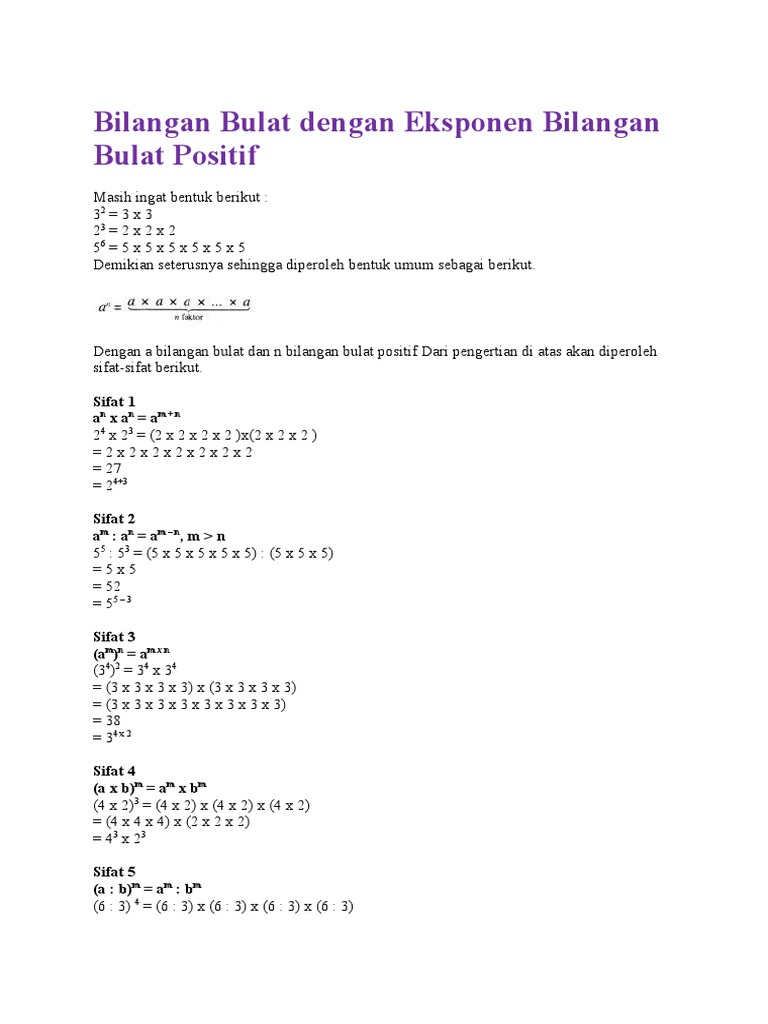 Bilangan bulat adalah kumpulan bilangan yang terdiri dari bilangan bilangan bulat negatif bilangan nol dan bilangan bulat positif. Bilangan berpangkat bulat positif memiliki beberapa sifat juga nih quipperian. Kamu bisa lho menerapkan salah satu sifat bilangan berpangkat bulat positif pada operasi perkalian yang ada di dalam soal ini. Pengertian bilangan bulat adalah himpunan yang terdiri dari bilangan bulat negatif nol dan positif. Supaya lebih jelas cobalah perhatikan contoh dalam tabel berikut ini. Dari contoh contoh diatas ternyata sifat sifat dari operasi bilangan berpangkat positif juga berlaku pada bilangan berpangkat negative dari a b termasuk bilangan real sedangkan m n merupakan bilangan bulat negative.
