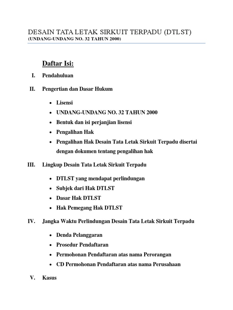 Undang undang nomor 32 tahun 2000 tentang desain tata letak sirkuit terpadu diperlukan sebab indonesia telah meratifikasi agreement establishing the world trade organization persetujuan pembentukan organisasi perdagangan dunia yang mencakup agreement on trade related aspects of. Desain tata letak sirkuit terpadu integrated circuit adalah merupakan bagian dari temuan yang didasarkan pada kreativitas intelektual manusia yang menghasilkan fungsi elektronikistilah integrated circuit ic adalah merupakan istilah yang dikenal dalam teknik digitalic adalah merupakan komponen elektronik yang terdiri dari kombinasi transistor diode resistor dan kapasitor. Sedangkan pngertian sirkuit terpadu sendiri adalah suatu produk dalam bentuk jadi atau setengah jadi yang di dalamnya terdapat berbagai elemen dan sekurang kurangnya satu dari elemen tersebut adalah. Desain tata letak sirkuit terpadu sebagai bagian dari sistem hak kekayaan intelektual diatur dengan undang undang. Berikut informasi sepenuhnya tentang contoh kasus desain tata letak sirkuit terpadu. Admin blog temukan contoh 2019 juga mengumpulkan gambar gambar lainnya terkait contoh kasus desain tata letak sirkuit terpadu dibawah ini.
