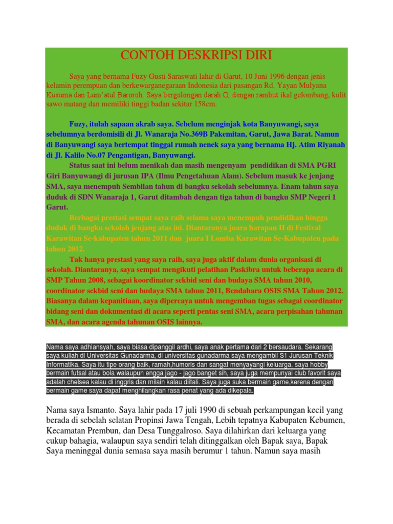Contoh deskripsi diri yang menarik. Saya bisa merasakan begitu bersantai tetapi jika teman teman saya meminta saya untuk menyanyi di panggung saya merasa sangat takut dengan itu. 12 contoh karangan deskripsi pengertian ciri tujuan pendekatan pengembangan langkah jenis. Menulis deskripsi diri di dalam cv sangatlah penting lalu seperti apa contoh deskripsi diri yang menarik perhatiaan rekruter. Bila kamu masih bingung dengan bagaimana cara mendeskripsikan diri saat menjawab interview lamaran pekerjaan di bawah ini ada beberapa contoh cara mendeskripsikan diri yang bisa kamu ikuti. Panjang dan format yang tepat mungkin berbeda beda. Untuk pembahasan kali ini kami akan memberikan ulasan mengenai karangan deskripsi yang dimana dalam hal ini.
