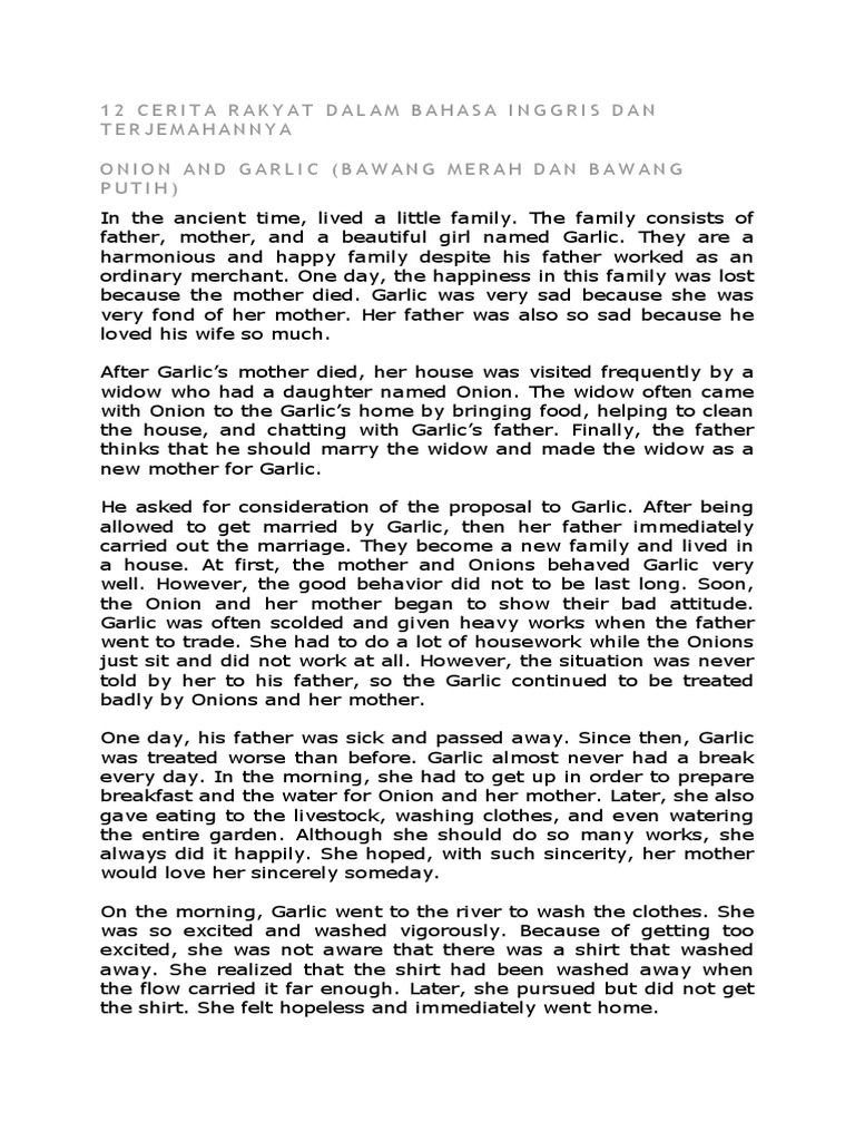 She was happy live with her father and mother. Sebelum kita melihat berbagai koleksi dongeng yang ada lebih dulu kita akan membaca sebuah dongeng yang diceritakan dalam bahasa inggris. They were prince raden putra and also dewi limaran. Pengertian dan penjelasan proper noun dalam bahasa inggris dan contoh kalimatnya. 15 cerita rakyat singkat dalam bahasa inggris batu menangis the crying stone batu menangis. Cerita malin kundang dalam bahasa inggris.