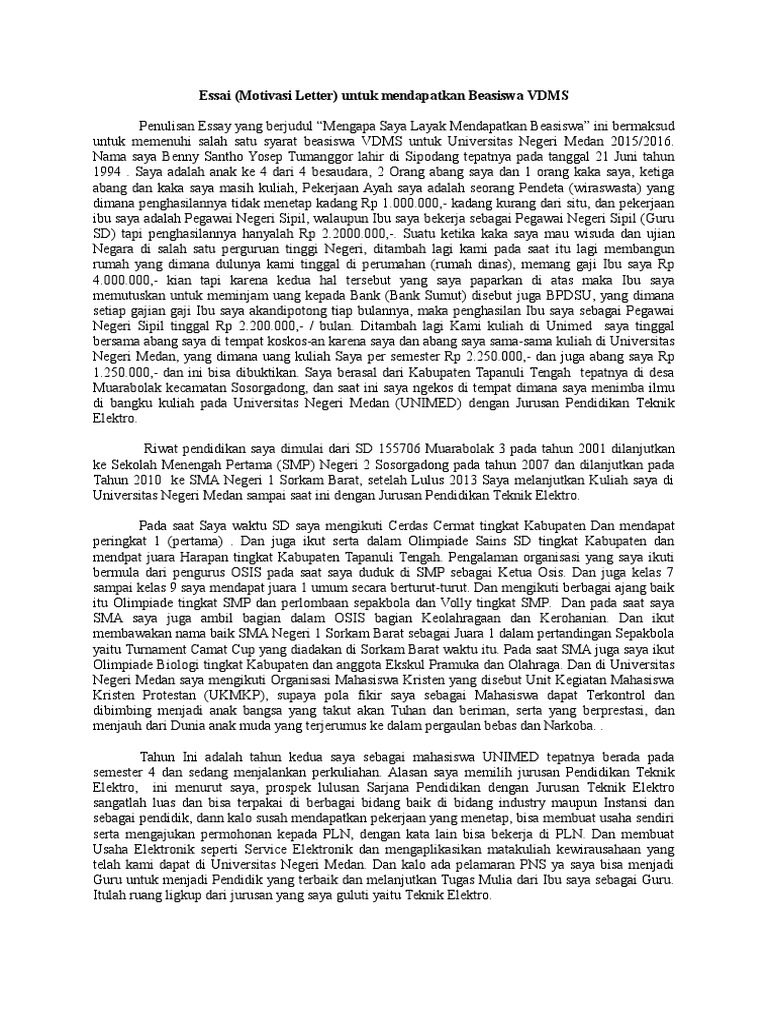 Kebetulan essay ini saya buat sebagai salah satu syarat magang di net. Essay adalah karangan yang tidak mudah basi ketika dibaca berkali kali. Apa arti usia 17 bagi kalian semua. Latar belakang pendidikan dan latar belakang keluarga kemudian juga alasan dan motivasi mengikuti program beasiswa yang ditawarkan kelebihan yang kita miliki alasan mengapa kita pantas untuk mendapatkan beasiswa tersebut. Untuk persyaratannya kalian bisa baca sendiri di web beasiswa unggulan. Berikut adalah contoh essay tentang diri sendiri.