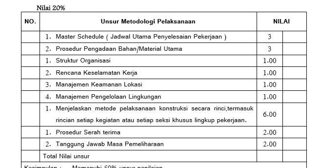 Metode evaluasi sistem nilai hanya digunakan untuk pekerjaan kompleks dengan kriteria tertentu sesuai perpres 542010 pasal 1 ayat. Tujuan dan manfaat penelitian a. Evaluasi penilaian penawaran dengan cara memeriksa dan membandingkan dokumen penawaran terhadap pemenuhan persyaratan yang telah ditetapkan dalam dokumen pemilihan penyedia barangjasa yang telah ditetapkan dalam dokumen pemilihan barangjasa dengan urutan proses evaluasi dimulai dari penilaian kewajaran harga terhadap penyedia barangjasa yang tidak lulus penilaian pada setiap. Metode evaluasi dengan sistem gugur merupakan evaluasi penilaian penawaran dengan cara memeriksa dan membandingkan dokumen penawaran terhadap pemenuhan persyaratan minimal yang telah ditetapkan dalam dokumen pemilihan penyedia barangjasa dengan urutan proses evaluasi dimulai dari penilaian persyaratan administrasi persyaratan teknis dan kewajaran harga dan terhadap penyedia barangjasa yang. Lebih dalam mengenai penerapan metode evaluasi penawaran dengan sistem gugur dan sistem nilaidaftar simak dan passing gradeambang lulus sehingga berpengaruh bagi hasil evaluasi penawaran. Evaluasi yang menggunakan sistem gugur dengan ambang batas dilakukan dengan membandingkan pemenuhan persyaratan teknis perolehan nilai unsur dan sub unsur yang ditetapkan dalam ldp.