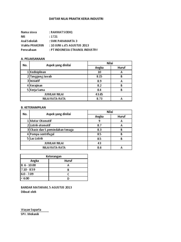 Program praktek kerja lapangan mahasiswa jurusan tehnik informatika komputer. Selanjutnya anda hanya perlu menyesuaikan dengan tujuannya. Pastikan bahwa dalam pembuatannya semua proses benar dan sesuai. Contoh format penilaian lomba pidato kriteria penilaian lomba pidato. Pelaksanaan dan tanggung jawab atas pekerjaan yang dilakukan. Pkl 7 nama instansiperusahaan 8 unit kerja 9 alamat instansi perusahaan 10 telepon 11 pembimbing pkl di instansiperusahaan no unsur penilaian nilai angka huruf kedisiplinan 1 ketepatan waktudisiplin 2 sikap kerjaprosedur kerja 3 tanggung jawab terhadap tugas 4 kehadiranabsensi prestasi kerja 5 kemampuan kerja 6 keterampilan kerja 7 kualitas hasil kerja kemampuan beradaptasi 8 kemampuan.