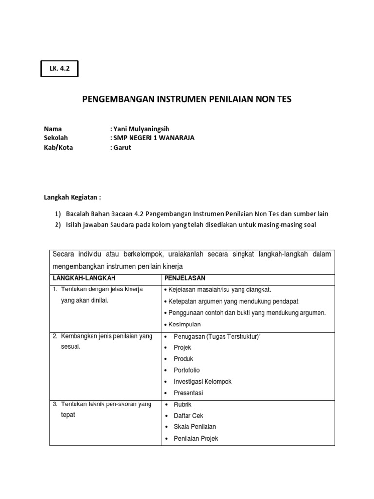 Contoh instrumen non tes. Observasi wawancara angket daftar cek skala penilaian dan lain sebagainya yang dapat dilakukan guru untuk mengevaluasi peserta didiknya. Melakukan uji coba 7. Unsur unsur fisik dan sosial kawasan asia tenggara. Negara negara di kawasan asia tenggara mei 3 2012 14 november 2 oktober 4 september 1 juni 1 mei 6. Penyusunan instrumen tes dan non tes sebagai instrumen penilaian pembelajaran. Tehnik penilaian ini umumnya untuk menilai kepribadian anak secara menyeluruh meliputi sikap tingkah laku sifat sikap sosial ucapan riwayat hidup dan lain lain.