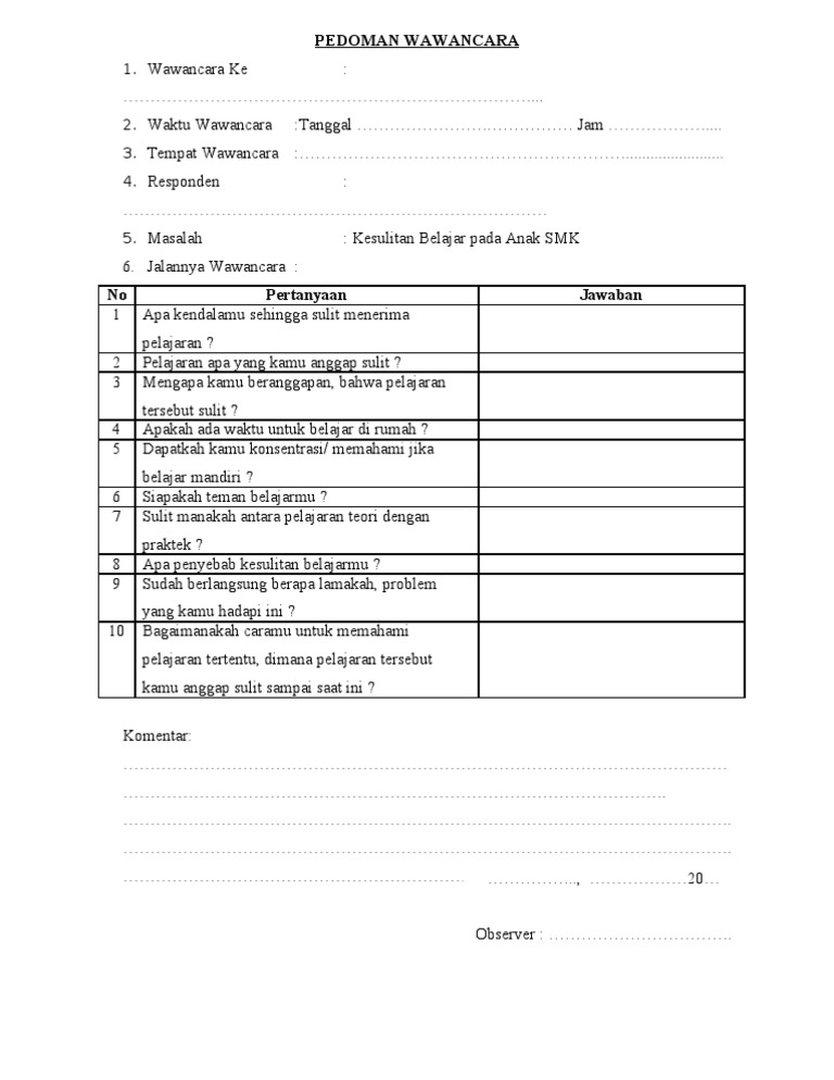 Contoh instrumen wawancara untuk siswa. Instrumen pedoman wawancara dan angket respon siswa. Kapan sekolah ini berdiri. Kepala sekolah ma raudlatul muttaqin kemampuan siswa dalam mengikuti pembelajaran bahasa arab khususnya maharah qiraah tidak terlalu aktif hal yang melatar belaki ini adalah segian banyak dari siswa adalah bukan dari pondok yang notabennya tidak tau atau jarang mendengar dan membaca kosa kata bahasa arab bahkan. Misalnya bagaimana menciptakan kondisi yang baik agar berhasil memilih metode dan alat alat sesuai dengan jenis dan situasi belajar membuat rencana belajar bagi siswa menyesuaikan proses belajar dengan keunikan siswa penilaian hasil belajar diagnosis kesulitan belajar dan sebagainya. Contoh instrumen wawancara penelitian. Analisis data hasil wawancara.