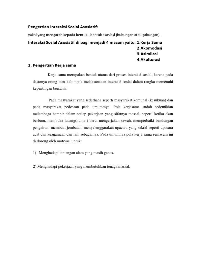 Sangat jarang terjadi seorang pemain sepak bola mencetak gol tanpa bantuan temannya. Berdasarkan pendapat gillin menyebutkan dua macam dari proses sosial dengan timbul dari akibat adanya interaksi sosial yaitu proses asosiatifbersekutu processes of association dan proses disosiatifmemisahkan processes of dissociation. Interaksi sosial asosiatif pola hubungan interaksi sosial yang bersifat asosiatif dapat tercipta karena adanya kerja sama akomodasi asimilasi dan akulturasi. Proses sosial yang mengarah kepada bentuk bentuk asosiasi hubungan atau gabungan. Interaksi asosiatif adalah segala bentuk hubungan interaksi yang terjadi di masyarakat yang bersifat membangun mempererat maupun memperkuat hubungan antar sesama di lingkungan sosial. Dalam praktek nya asosiatif sering di temukan di masyarakat dan pedesaan.