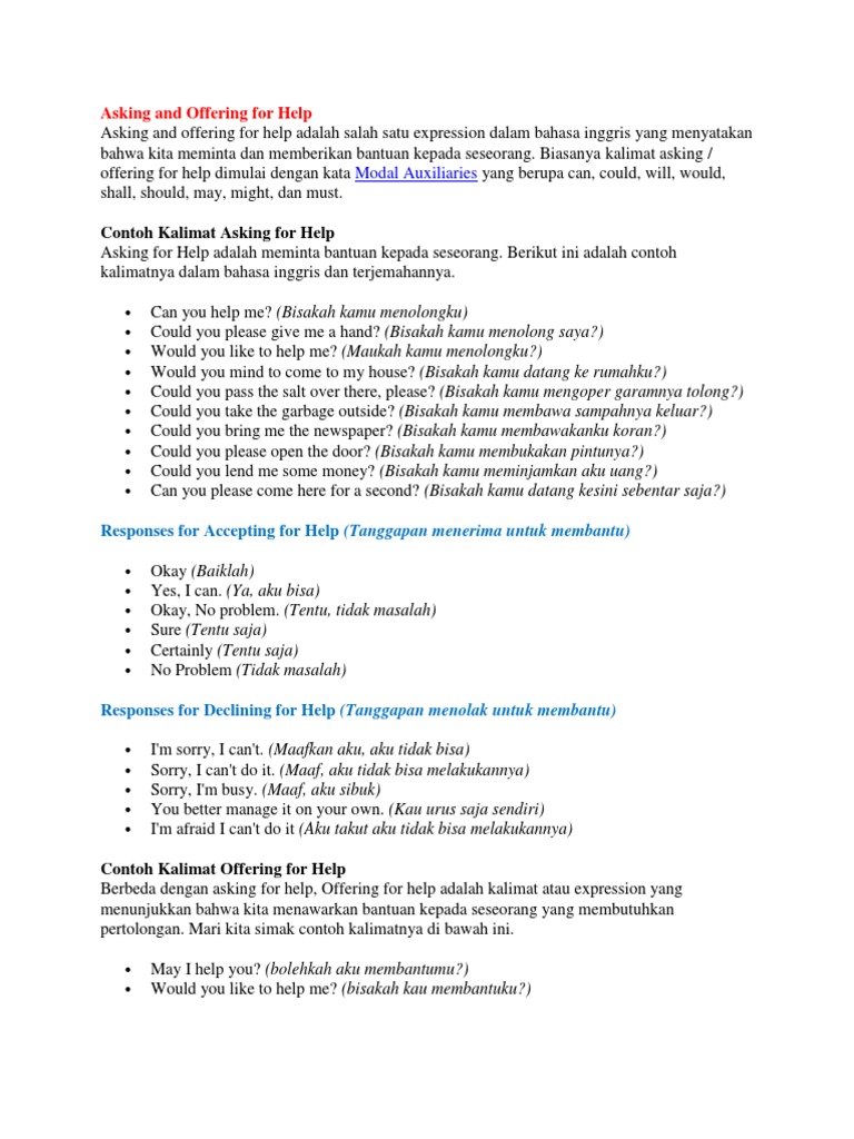 Contoh kalimat offering help. 50 contoh kalimat passive voice 350 kata kerja bahasa inggris announcement di bandara asking and giving information asking and giving opinion contoh contoh adjective contoh article a an the contoh decriptive text contoh dialog agreement disagreement contoh dialog asking and giving opinion contoh greeting card contoh invitation birthday party contoh kalimat passive voice contoh kalimat past. Contoh kalimat asking for help asking for help adalah meminta bantuan kepada seseorang. Kali ini english café akan lebih membahas contoh pengunaannya pada suatu percakapan. Bagi yang masih belum tahu cara untuk menawarkan bantuan dalam bahasa inggris silahkan disimak baik baik ya guys contoh percakapan bahasa inggris tentang offering help beserta artinya berikut ini. Dialog agreement disagreement contoh dialog asking and giving opinion contoh greeting card contoh invitation birthday party contoh kalimat passive voice contoh kalimat past future tense contoh kalimat possesive pronoun contoh narrative text contoh noun daftar noun di rumah. I dont think i will pass chemistry this semester.