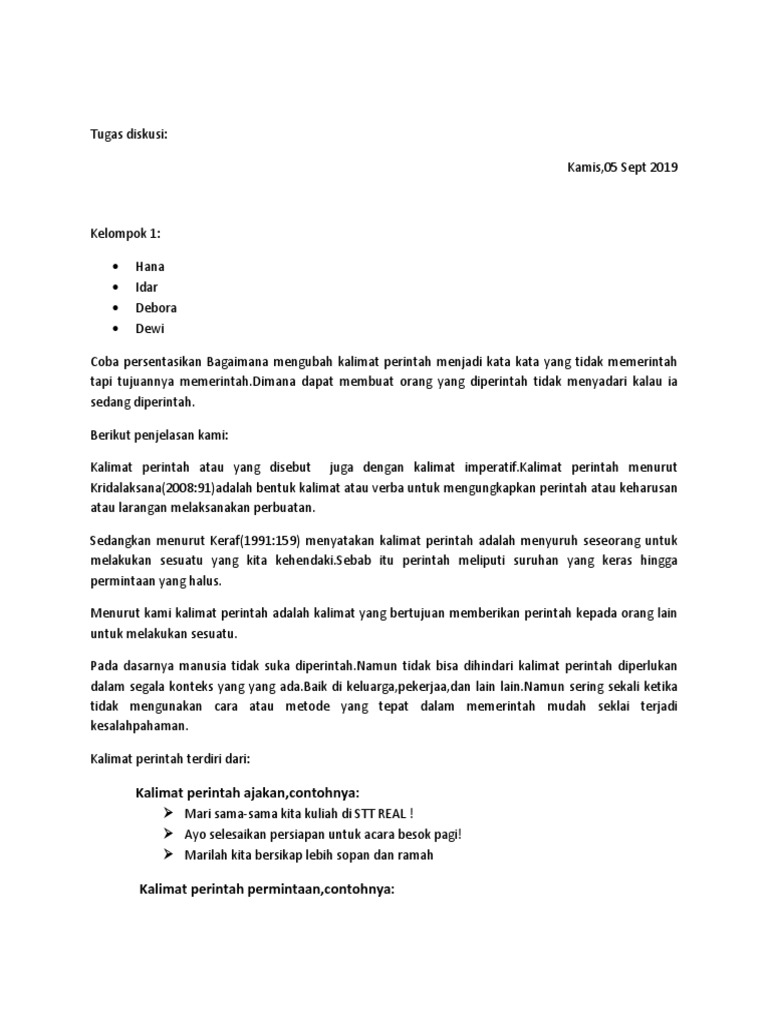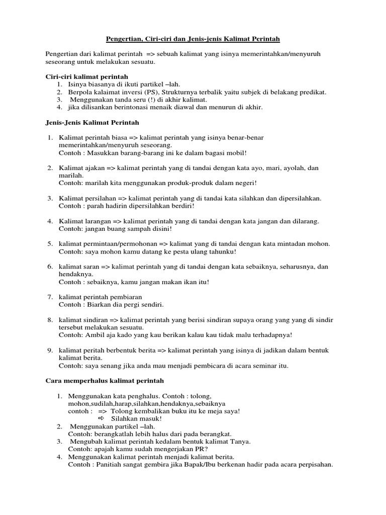 Ciri ciri kalimat perintah umumnya diakhiri oleh sebuah tanda seru. Ayo ikuti kemana pencuri itu pergi. Ayo selesaikan sekarang untuk. Contoh kalimat perintah kalimat perintah adalah salah satu kalimat yang mengandung makna perintah atau larangan. Pengertian kalimat perintah menurut kamus besar bahasa indonesia kbbi adalah kalimat yang mengandung intonasi dan makna perintah atau larangan. Untuk memahaminya lebih lanjut terkait dengan kalimat perintah permintaan kalimat perintah ajakan kalimat perintah larangan kalimat perintah permohonan kalimat perintah bersyarat kalimat perintah ajakan.