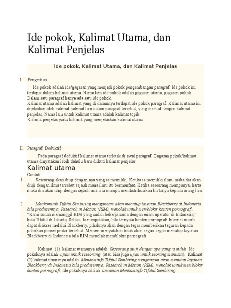 Contoh kalimat utama dalam suatu paragraf pastinya ada kalimat utama kalimat penjelas dan ide pokok. Oleh karena itu kami akan membahas mengenai contoh kalimat utama dengan tujuan kalian dapat memahami atau menjadi lebih paham terhadap kalimat utama. Contoh kalimat utama di awal paragraf deduktif memasuki arus globalisasi beberapa hal terkait iptek yang semakin canggih menjadi boomerang bagi masyarakat indonesia. Pengertian kalimat penjelas ciri dan contoh kalimat penjelas lengkap kalimat penjelas adalah kalimat yang bersifat khusus dan berfungsi untuk mengembangkan gagasan utama atau kalimat utama pada suatu paragraf. Kalimat utama terletak di awal dan akhir paragraf campuran kalimat utama. Kalimat 2 kalimat utamanya adalah sesungguhnya dosa besar maupun kecil bila dilakukan secara terus menerus akan berdampak sangat buruk bagi jiwa dan raga pelakunya.