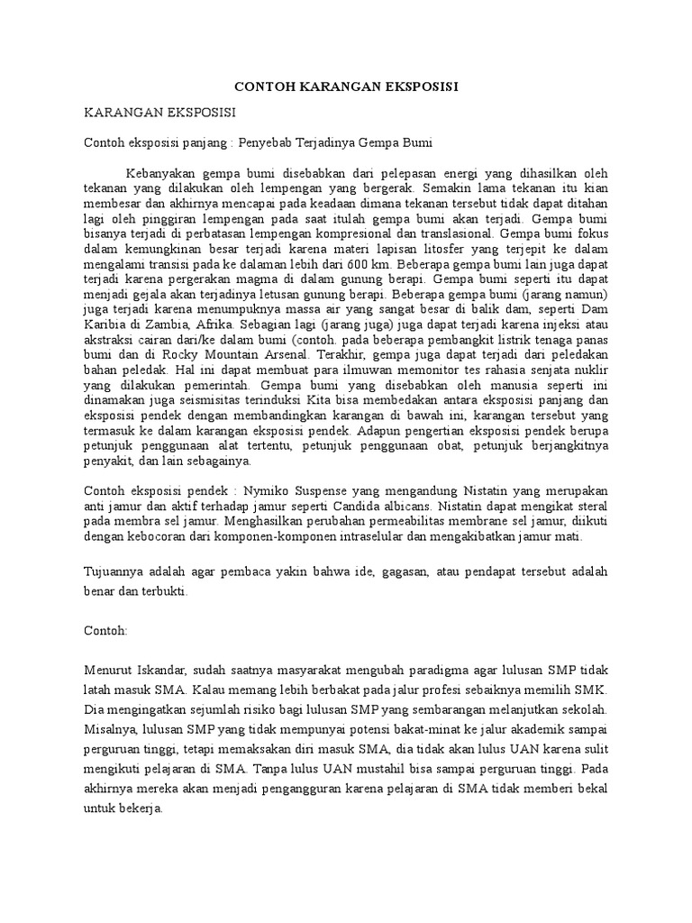 Jenis karangan eksposisi biasa ditemukan dalam berita berita. Karangan eksposisi adalah salah satu dari jenis karangan yang berisi informasi atau pengetahuan yang disajikan secara singkat akurat dan padat. Contoh paragraf eksposisi singkat setelah sebelumnya kita sudah mengetahui contoh teks eksplanasi kali ini kita akan menambah contoh paragraf eksposisi berbeda dengan eksplanasi yang sebelumnya eksposisi adalah karangan yang menerangkan tentang informasi atau pengetahuan untuk lebih jelasnya anda bisa menganalisa contoh yang sudah kami berikan diatas dan bandingkan dengan contoh paragraf. Karangan eksposisi atau dapat disebut teks eksposisi memiliki tujuan memaparkan atau menjelaskan informasi tertentu guna menambah wawasan pembaca. Secara terminologi teks eksposisi adalah merupakan sebuah teks yang bersifat mengajak dan berisi sejumlah informasi yang ditulis. Sehingga apa bila membaca teks tersebut maka seseorang mampu memperoleh sebuah informasi berharga.