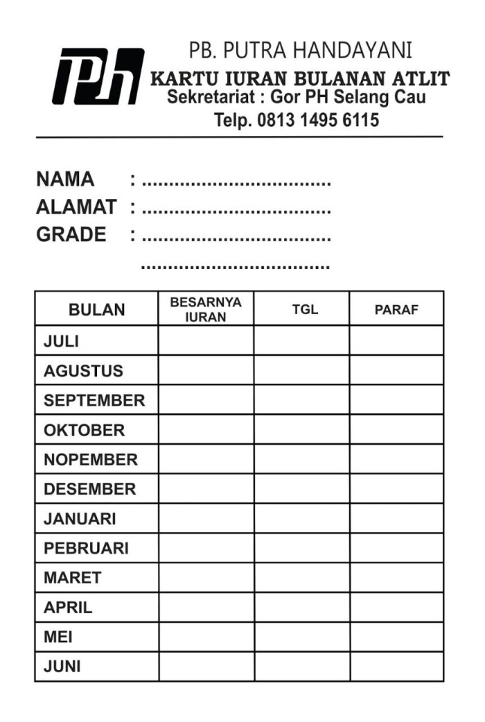 Contoh kartu iuran bulanan. Contoh kartu iuran bulanan siswa paud minggu april 30 2017 tambah komentar administrasi paud untuk mempermudah pembuatan kartu iuran bulanan siswa paud atau kartu catatan spp siswa kami bagikan salah satu contohnya yang bisa di edit softcopy nanti sesuai dengan logo sekolah masing masing dalam format word. Harga yang bersaing dengan kualitas terjamin dan ketepatan waktu membuat kami berbeda daripada yang lainnya. Kartu iuran bulanan warga rt29. Berikut adalah contoh format kartu iuran bulanan untuk paud dan tk yang bisa digunakan dan diedit dengan mudah sesuai kebutuhan masing masing sekolah. Ini adalah contoh atau format untuk buku iuran warga yang tiap bulannya akan dimintai iuran oleh para petugas dari pengurus rt. Kartu prestasi tpa beserta hafalan.