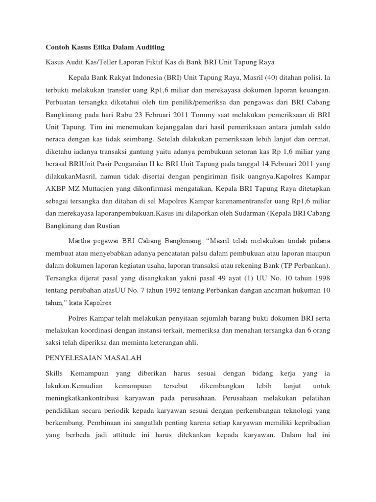 Etika dalam auditing contoh kasus menurut bahasa yunani kuno etika berasal dari kata ethikos yang berarti timbul dari kebiasaan. Contoh kasus audit piutang usaha. Pada perusahaan a terdapat piutang dari pihak x pihak y pihak z. Contoh kasus dan pemecahan masalah mengenai audit keuangan free download as word doc doc docx pdf file pdf text file txt or read online for free. Dalam kasus ini contoh alat ukur yang telah dipergunakan misalnya penggaris bukanlah hal yang tepat untuk dijadikan focus alasan saat memutuskan pengecualian untuk sub clause 76. Contoh kasus audit.
