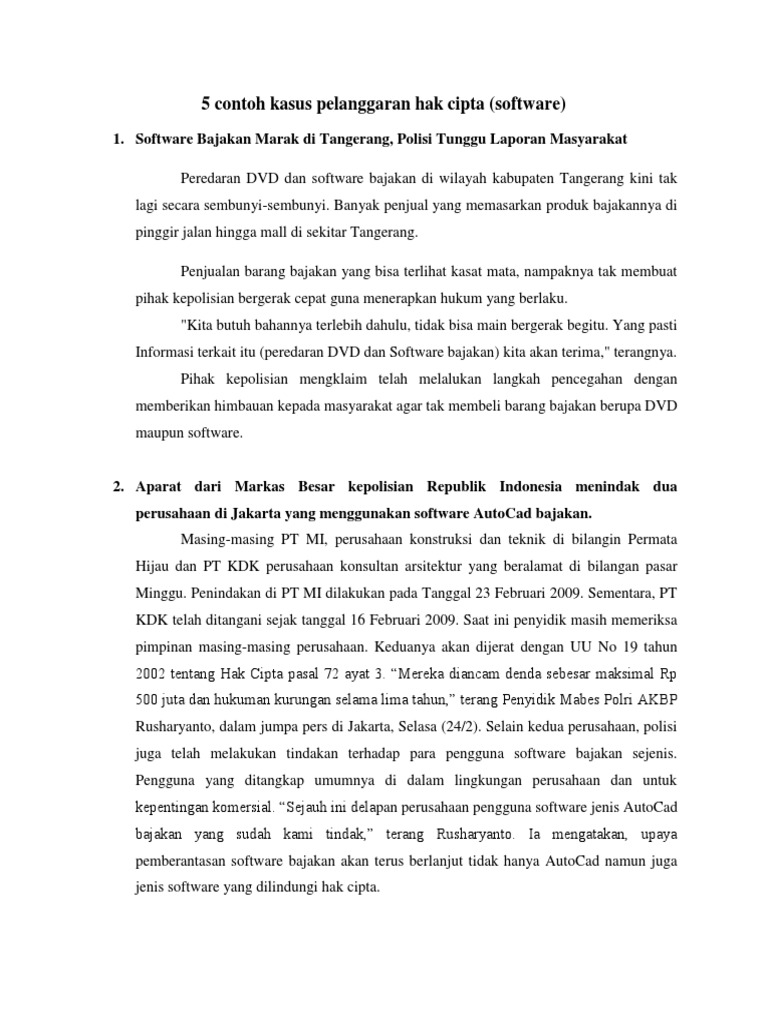 Perusahaan asal india mengklaim penggunaan dua busi dalam satu silinder pada produk mereka itu merupakan ystem pertama yang digunakan di dunia. Contoh kasus hak cipta dan analisisnya. Mungkin anda pernah mendengar kata hak cipta. Selamat datang di pakdosencoid web digital berbagi ilmu pengetahuan. Pemerintah harus dapat memberikan sanksi tegas seperti yang tertulis dalam pasal 72 tentang undang undang hak cipta yaitu bagi mereka yang dengan sengaja atau tanpa hak melanggar hak cipta orang lain dapat dikenakan pidana penjara paling singkat 1 satu bulan danatau denda paling sedikit rp 100000000 satu juta rupiah atau pidana penjara paling lama 7 tujuh tahun danatau denda paling. Sebuah negara dapat menjalankan yurisdiksi kriminal dan privat terhadap warga negaranya meskipun yang bersangkutan sedang berada di negara lain.