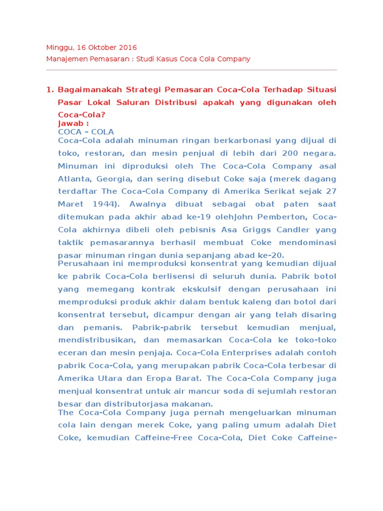 Contoh kasus pemasaran coca cola. Strategi pemasaran coca cola mempunyai ciri khas tersendiri yang unik dan kreatif. Silakan download pada link. Apakah keunggulan bersaing yang ditawarkan produk coca cola menurut five force of competition. Inovasi kemasan produk akan terus dikembangkan sesuai dengan perkembangan teknologi terbaru. Studi kasus coca cola studi kasus pemasaran global profil the coca cola company the coca cola company merupakan perusahaan minu. Jurnal penelitian pemasaran pdf contoh jurnal penelitian pemasaran pdf sangat penting untuk mahasiswa ekonomi.