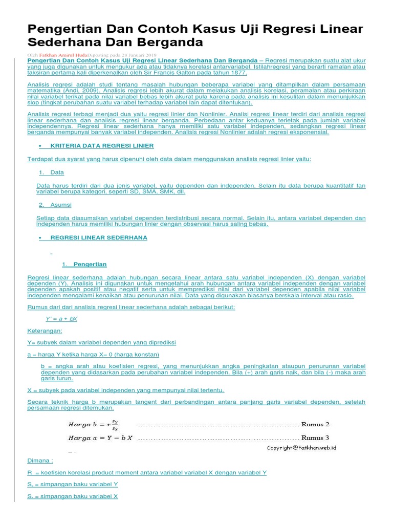 Pengertian dan contoh soal regresi linier berganda. Salah satu contoh penelitian yang menggunakan analisis regresi linear berganda adalah penelitian dengan judul. Pengertian dan contoh kasus uji regresi linear sederhana dan berganda regresi merupakan suatu alat ukur yang juga digunakan untuk mengukur ada atau tidaknya korelasi antarvariabel. Istilahregresi yang berarti ramalan atau taksiran pertama kali diperkenalkan oleh sir francis galton pada tahun 1877. Analisis regresi linier berganda adalah hubungan secara linear antara dua atau lebih variabel independen x 1 x 2x n dengan variabel dependen yanalisis ini untuk mengetahui arah hubungan antara variabel independen dengan variabel dependen apakah masing masing variabel independen berhubungan positif atau negatif dan untuk memprediksi nilai dari variabel dependen apabila nilai variabel. Contoh kasus regresi berganda kasus.