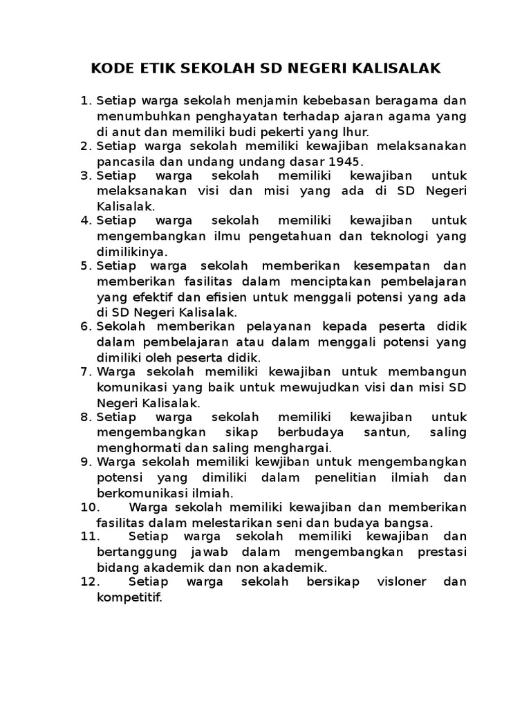 Kode etik ini merupakan tolok ukur bahwa sekolah itu sudah bisa dikatan sekolah yang baik dan layak. Kode etik guru di indonesia terbaru lengkap. Contoh kode etik sekolah guru dan siswa dalam rangka meningkatkan kepercayaan dan penilaian masyarakat terhadap suatu sekolah atau lembaga pendidikan lainnya guru dan siswa. Contoh kasus pelanggaran kode etik guru dijelaskan pula bahwa ketegasan seorang guru di dalam memberikan hukuman kepada peserta didik memang sangat dibutuhkan. Contoh kode etik sekolah dasar kode etik dalam sebuah sekolah merupakan suatu hal yang harus ada dan wajib ada karena sangat berkaitan dengan kemajuan sekolah. Contoh kode etik sekolah kurikulumsekolahku hallo sahabat semua tentang sekolah pada artikel yang anda baca kali ini dengan judul contoh kode etik sekolah kurikulumsekolahku kami telah mempersiapkan artikel ini dengan baik untuk anda baca dan ambil informasi didalamnya.
