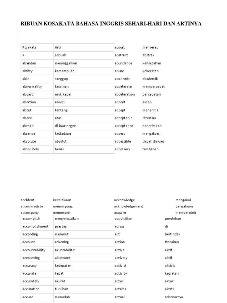 Mempelajari kosakata adalah cara mudah belajar bahasa inggris untuk pemula sebagai langkah pertama agar lancar bahasa inggris. Kata benda bahasa inggris dan artinya. Banyak orang terlalu berkutat dengan grammar dan pola kalimatsehingga melupakan hakikat sebenarnya dari bahasa itu sendiri. Daftar kosakata kata benda bahasa inggris ini disusun dari berbagai sumber. 1001 contoh kalimat bahasa inggris dalam kehidupan sehari hariartinya. Pilihlah satu kata kata apa saja bebas.