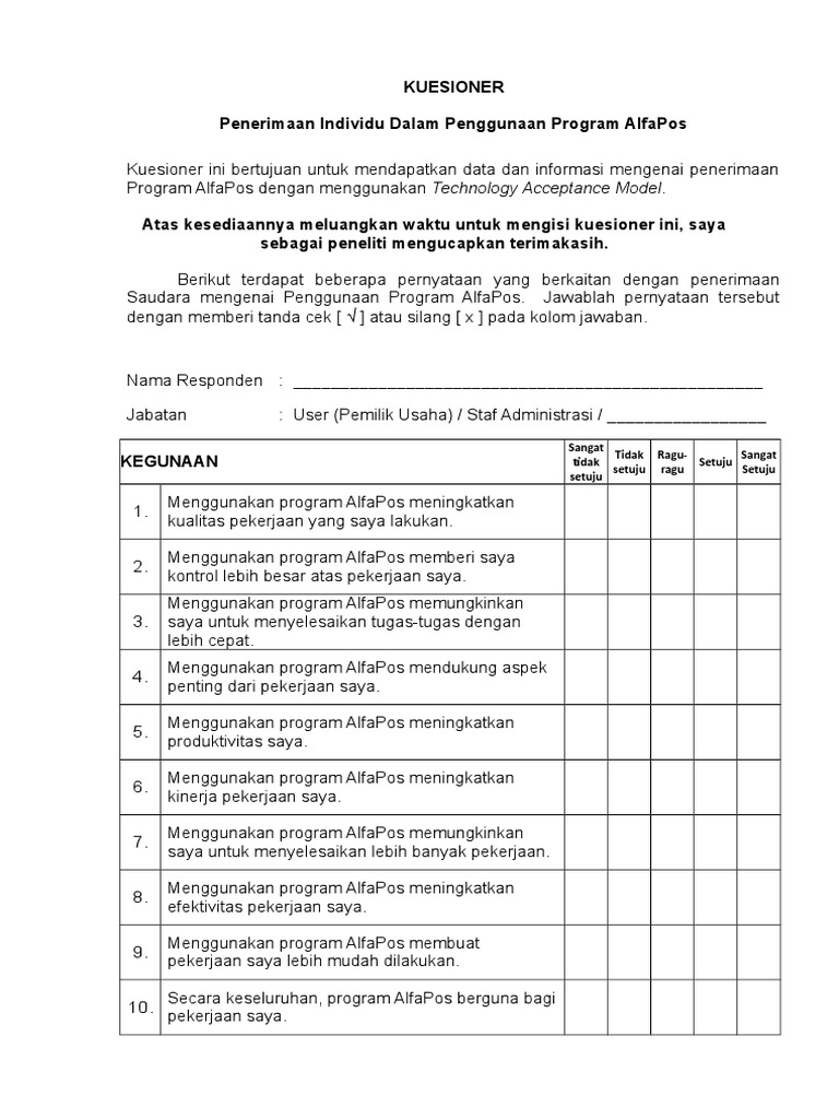 Berilah tanda silang x pada jawaban yang anda pilih. Kuesioner penelitian determinan technology acceptance model terhadap sikap. Model penelitian menggunakan technology acceptance model tam dengan dua. Penggunaan technology acceptance model terhadap intensi pebisnis dalam menggunakan e commerce studi pada penerima program mahasiswa wirausaha universitas lampung tahun 2014 penelitian ini bertujuan untuk mengetahui pengaruh technology acceptance model tam terhadap intensi pebisnis dalam menggunakan e commerce. Cash deposit machine cdm atau mesin setor tunai. Technology acceptance model tam technology acceptance model tam atau model penerimaan teknologi merupakan salah satu teori tentang penggunaan sistem teknologi informasi yang dianggap sangat berpengaruh dan umumnya digunakan untuk menjelaskan penerimaan individual terhadap penggunaan sistem teknologi informasi 6.