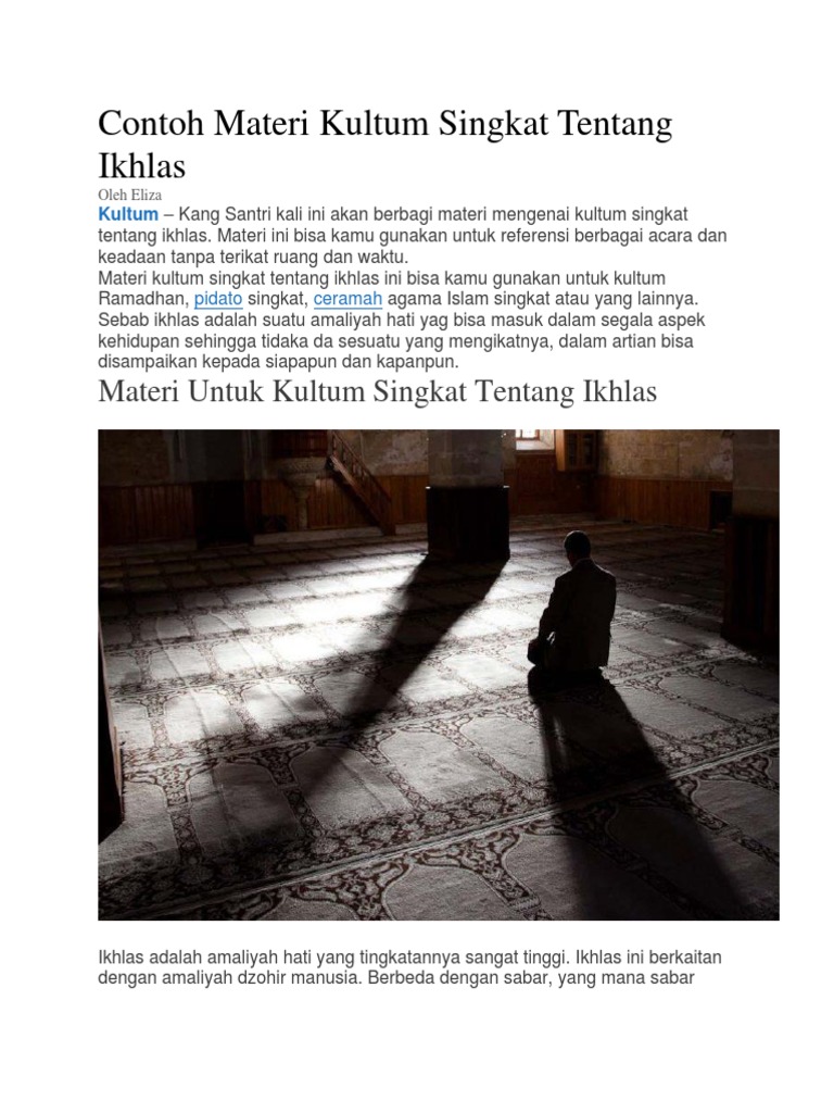 Contoh kultum tentang ikhlas. Contoh ceramah singkat tentang ikhlas. Ikhlas kata yang mudah diucapkan tapi sangat sulit untuk dilakukan. Kultum sebelum masuk dalam teks kultum singkat kultum terbaik ceramah agama islam ceramah pendek kultum singkat tentang sabar dll. Seseorang yang ikhlas tidak akan tidak akan mengharapkan pujian dari sesama makhluk. Fitnah yang dimaksud di sini adalah yang menimpa individu atau golongan. Materi ini bisa kamu gunakan untuk referensi berbagai acara dan keadaan tanpa terikat ruang dan waktu.