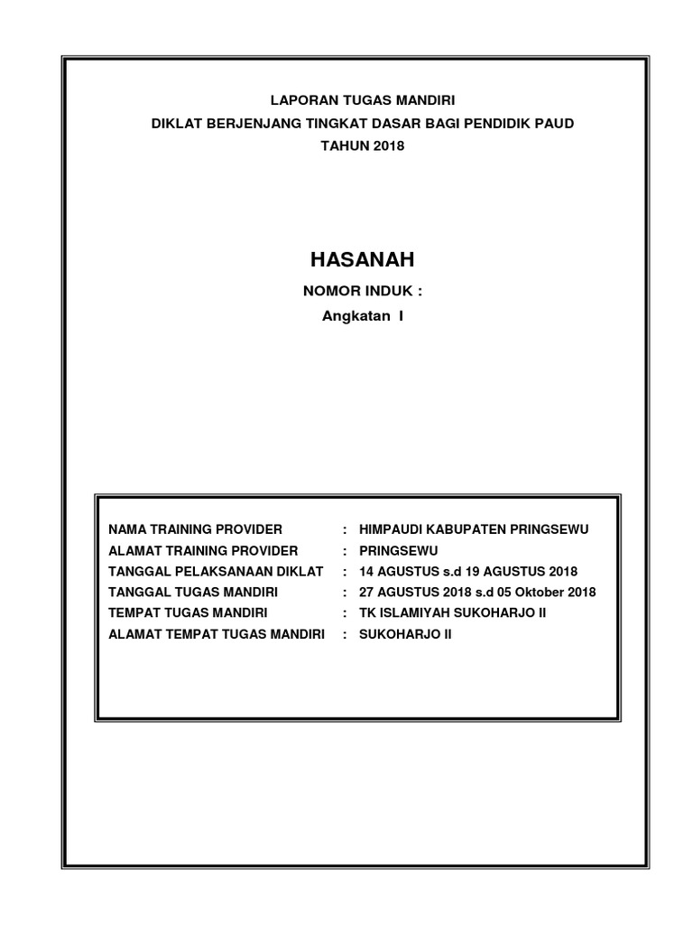 Alhamdulilah pada saat ini saya dapat menyelesaikan laporan tugas mandiri diklat dasar berjenjang pendidikan paud yang dilaksanakan pada tanggal 20 24 desember 2013. Laporan tugas mandiri diklat berjenjang tingkat dasar bagi pendidik paud kabupaten purbalingga tahun 2014 erlina nama traning provider. Laporan akhir tugas mandiri diklat berjenjang paud tk tingkat dasar 2014 1. Laporan tugas mandiri diksar berjenjang tingkat dasar bagi pendidik paud tahun 2017 laporan tugas mandiri. Dengan mengucap allhamdulillah saya bersyukur kepada allah swt karena atas berkat rahmat dan anugrahnya saya dapat menyelesaikan laporan tugas mandiri diklat berjenjang tingkat dasar bagi pendidik paud. Pelaksanaan tugas mandiri dimulai dari tanggal 10 oktober sampai dengan 11 november 2016.
