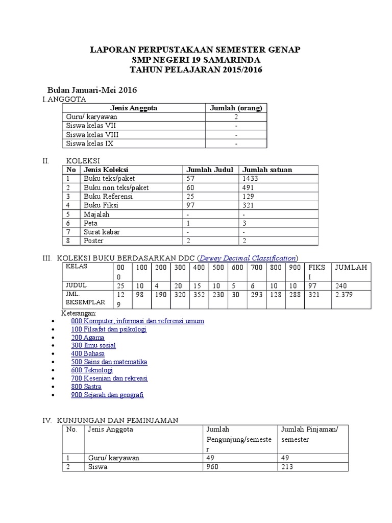 Tempat penataan buku atau biasa disebut dengan rak buku digunakan untuk menyimpan dan menata buku buku yang ada sesuia dengan sistem kearsipan yang diterapkan di perpustakaan tersebut dimana hal tersebut dilakukan agar pengunjung lebih mudah untuk mencari buku yang diinginkan. Contoh laporan kegiatan seminar laporan kegiatan seminar merupakan salah satu bentuk pertanggung jawaban yang biasanya dibuat sebagai bukti bahwa kita sebagai pembuat laporan benar benar telah melakukan atau mengikuti apa yang tertulis di dalam laporan tersebut yang dalam hal ini adalah kegiatan seminar. Contoh laporan triwulan perpustakaan sekolah berbagai macam kegiatan di perpustakaan membutuhkan laporan untuk menguraikan berlangsungnya kegiatanbermanfaat pula untuk mengetahui perkembangan dan proses peningkatan kegiatan yang dapat dijadikan rujukan untuk menyusun rencana kegiatan selanjutnya. Kumpulah contoh laporan lengkap laporan adalah suatu bentuk penyampaian berita keterangan pemberitahuan ataupun pertanggungjawaban baik secara lisan maupun secara tertulis dari bawahan kepada atasan sesuai dengan hubungan wewenang authority dan tanggung jawab responsibility yang ada antara mereka. Perpustakaan sebagai sumber informasi memegang peranan penting dalam pembangunan nasional dan merupakan sarana penunjang dalam pendidikan. Tapi ada 1 kegiatan tambahan yang kami laksanakan yaitu memasang papan openclose di pintu perpustakaan.