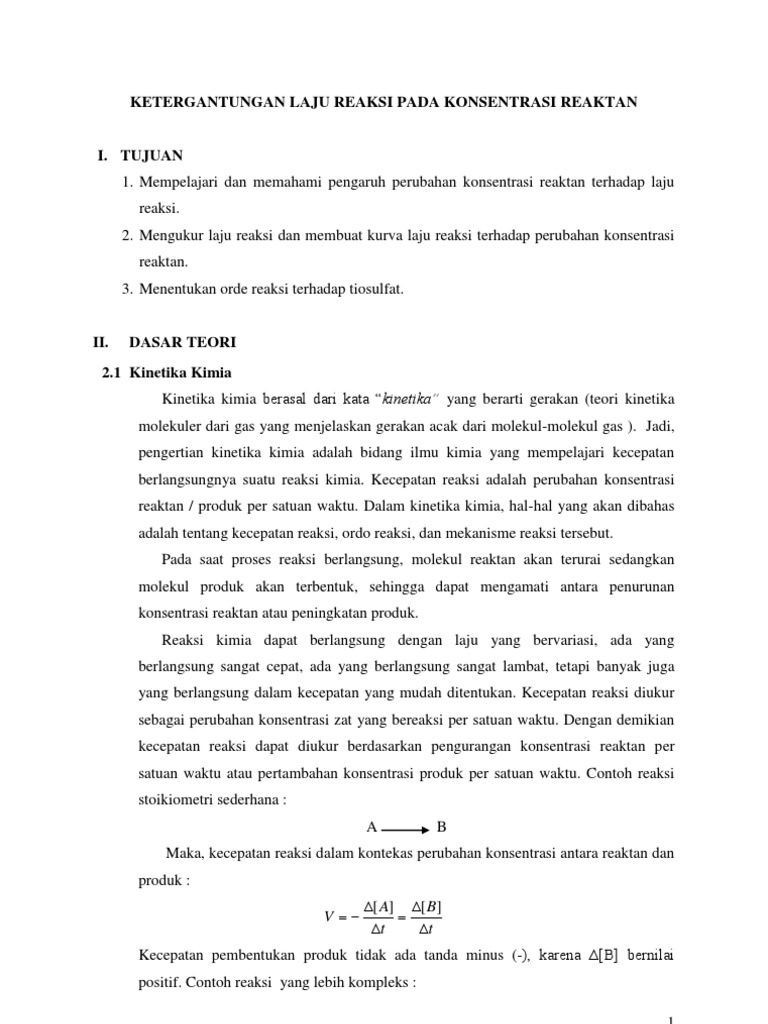 Contoh laporan praktikum laju reaksi. Oleh karena itu plot konsentrasi terhadap waktu berbentuk garis lengkung seperti gambar di bawah ini. Pada umumnya laju reaksi makin kecil seiring dengan bertambahnya waktu reaksi. Kenaikkan laju reaksi ini disebabkan dengan kenaikkan suhu atau menyebabkan makin cepatnya molekul molekul pereaksi bergerak sehingga memperbesar kemungkinan terjadi tabrakan yang efektif. Laju reaksi dipengaruhi oleh luas permukaansemakin besar luas permukaan zat padat yang direaksikan semakin lambat laju reaksinyanamunsemakin kecil luas permukaan zat padat yang direaksikan semakin cepat laju reaksi yang terjadi. Contoh laporan praktikum kimia. Laju reaksi atau kecepatan reaksi menyatakan banyaknya reaksi kimia yang berlangsung per satuan waktulaju reaksi menyatakan molaritas zat terlarut dalam reaksi yang dihasilkan tiap detik reaksi.