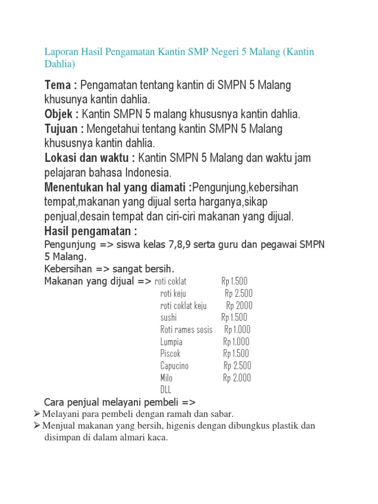 Kebersihan adalah bebas dari sampah sampah sehingga tercipta lingkungan bersih dan indah. Contoh hasil laporan pengamatan bahasa indonesia dengan membuat laporan pengamatan kita bisa mendapatkan hasil yang lebih fakta dan sesuai dengan kaidah kidah dalam pembuatan makalah laporancontoh penerapan laporan yang sering dilakukan adalah membuat pengamatan tentang sebuah masalah kemudian hasilnya akan dibuat laporan untuk dianalisa kemudian dicarikan solusi penyelesaian masalah. Kebun di belakang rumah mengalami polusi tanah karena banyaknya sampah yang dibuang sembarangan di kebun tanpa daur ulang. Begitulah yang dapat admin bagikan terkait contoh laporan keuangan perguruan tinggi swasta. Yang harus dilakukan untuk menunjang kebersihan sekolah kita adalah mengampanyekan buang sampah pada tempatnya. Ciri ciri laporan hasil observasi adalah sebagai berikut.