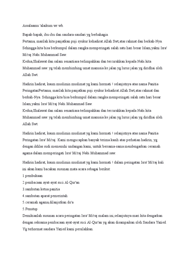 Contoh mc isra mi raj. Assalaamu alaikum wr wb. Teks pembawa acara pada acara isro miraj assalamualaikum warohmatullohi wabarokatuh hadirin sekalian yang kami muliakan kemuliaan dan kekuasaan hanyalah berada ditangan alloh semata. Singkat ceritanya disitu saya dapat mandat dari pengurus masjid untuk menjadi mauidloh hasanah. Contoh pidato peringatan isra miraj contoh pembawa acara mc peringatan isra miraj contoh proposal kegiatan peringatan isra miraj. Bapak bapak ibu ibu dan saudara saudari yg berbahagia. Unknown monday 26 january 2015.