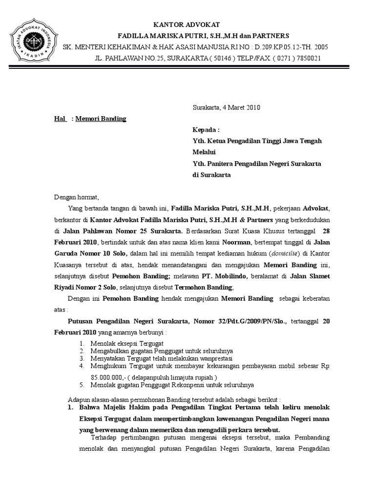 Dalam perkara perdata no. Kontra memori banding. Yahya harahap dalam buku kekuasaan pengadilan tinggi dan proses pemeriksaan perkara perdata dalam tingkat banding hal. Contoh surat memori banding penanganan perkara perdata kemahiran perdata kemper perancang. Pembanding semula para penggugat. Memori banding atas putusan perkara perdata no.
