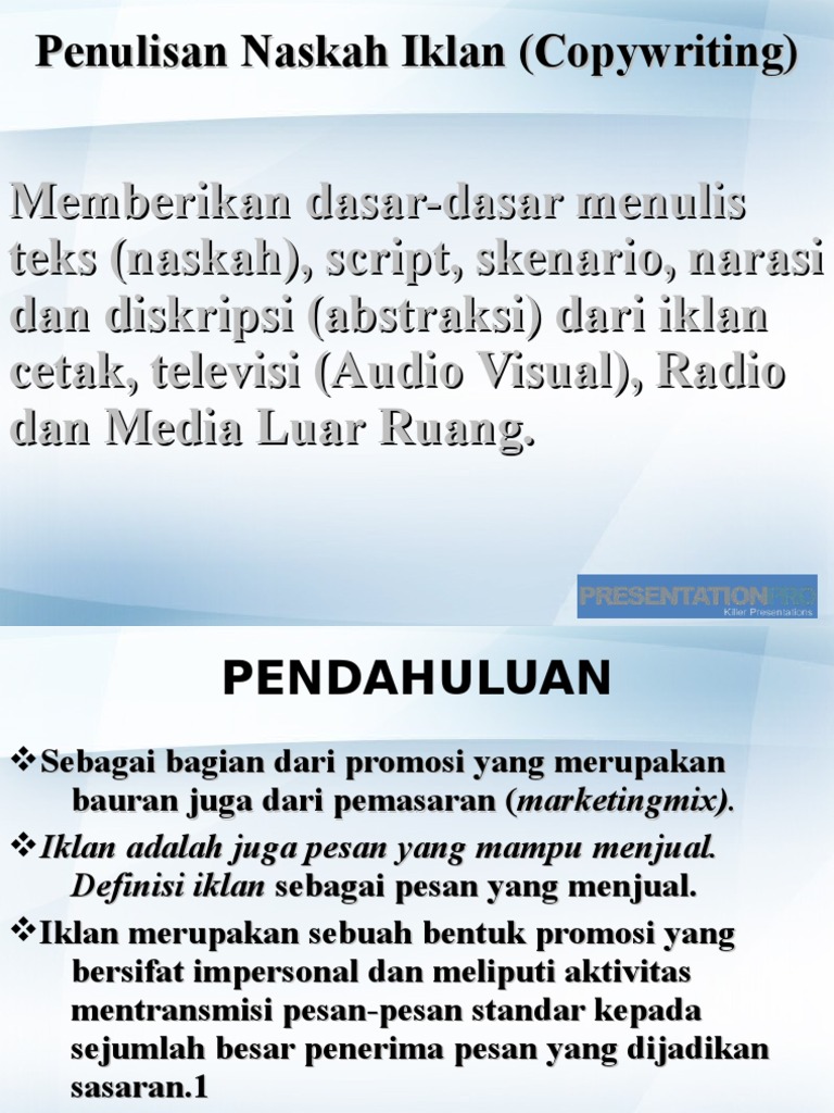 Contoh naskah iklan tv. Bagi adik adik sd smp atau sma yang diberi tugas untuk membuat kesimpulan sebuah iklan di tv berikut kami jelaskan salah satu contohnya dari iklan elektronik. Karena iklan tv waktunya pendek biasanya 30 detik maka kata katanya harus ringkas mudah diucapkan dan diingat. Teks iklan adalah sebuah tulisan atau kalimat dalam iklan yang berfungsi untuk menginformasikan mempengaruhi membujuk merayu dan mengingatkan masyarakat akan suatu produk atau jasa sehingga tertarik untuk membeli produkjasa atau melakukan tindakan sesuai yang diiklankan tersebut. Contoh iklan dalam bahasa inggris iklan layanan masyarakat iklan baris iklan lowongan kerja iklan produk iklan niaga iklan penawaran iklan makanan iklan kolom iklan bahasa jawa iklan komersial iklan keluarga iklan shampo iklan produk makanan. Merancang naskah merupakan spesifikasi lengkap dari teks dan narasi dalam iklan televisi. Apabila anda mencari contoh naskah berita televisi terbaru misalnya naskah berita tv liputan 6 atau contoh teks berita untuk acara televisi yang baik dan benar maka kali ini akan kita bahas bersama tentang apa itu naskah berita yang baik secara penulisan maupun kalimatnya.