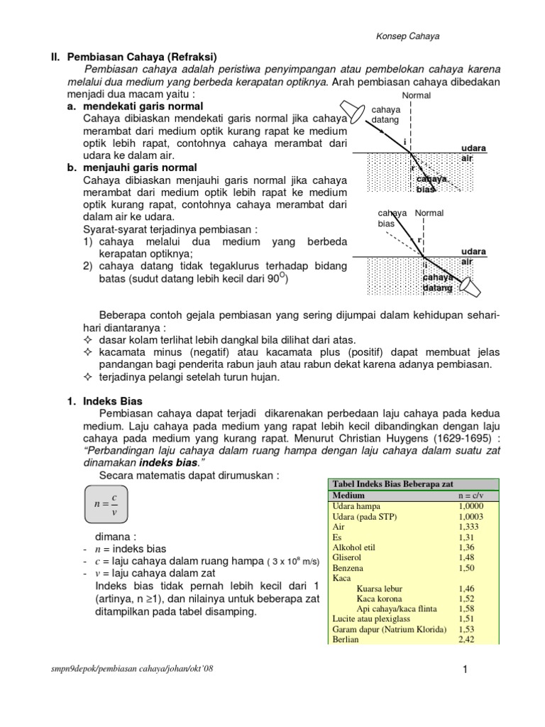 Pengertian pembiasan dan contoh kehidupan sehari hari refraksi atau pembiasan adalah pembengkokan gelombang ketika mereka melewati dari satu media ke yang lain karena adanya perubahan dalam kecepatan mereka. Pada prinsipnya jika cahaya yang merambat pada suatu medium berpindah ke medium yang lainnya maka batas pada kedua medium tersebut akan terjadi pembiasan atau pembelokan arah.