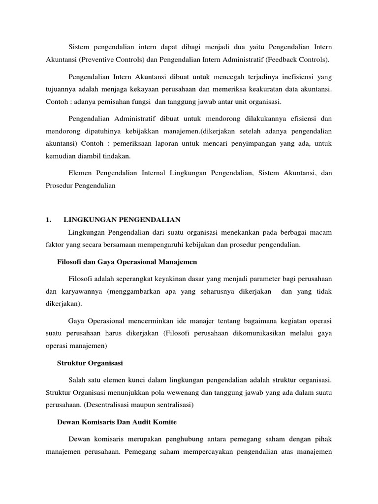Auditor internal dapat melaporkan masalah masalah dan hal hal yang mendapat perhatian khusus kepada komite audit atau dewan direksi yang independen terhadap manajemen perusahaan. Jika komputer yang digunakan sebagai alat bantu pengolahan data akan terjadi pergeseran dari sistem yang berorientasi pada orang ke sistem yang berorientasi pada komputer computer oriented. Sebagai contoh dalam suatu organisasi yang pimpinan puncaknya menganggap. Alasan perusahaan untuk menerapkan sistem pengendalian intern adalah untuk membantu pimpinan agar perusahaan dapat mencapai tujuan dengan efisien. Pada perusahaan besar auditor internal yang independen terhadap operasi biasanya bertanggung jawab atas pengawasan sistem pengendalian internal. Tujuan pengendalian internal adalah memberikan jaminan yang wajar bahwa.