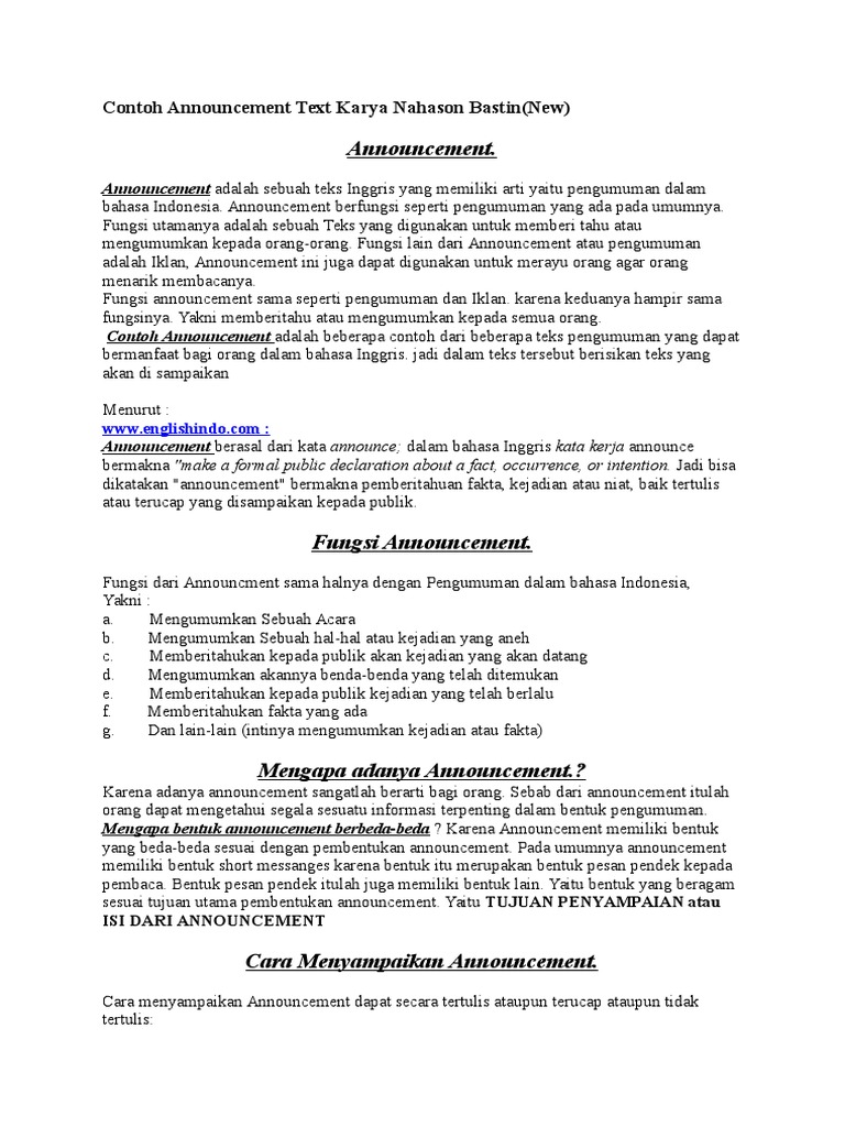This event will be held at all purpose space of al azhar junior high school. Announcement text atau teks pengumaman adalah salah satu materi pembelajaran yang hampir setiap tahunnya masuk ke dalam berbagai ujian mulai dari ujian harian ujian semester hingga ujian. Dalam kesempatan ini kita akan membahasnya. Contoh announcement announcement text atau lebih kita kenal daengan nama teks penguman adalah salah satu teks dalam bahasa inggris yang sangat mudah dan simpel untuk di pahami dibuat dan di pelajari. Semangat belajar dan terus belajar. Apa sebenarnya surat pengunduran diri atau resignation letter.