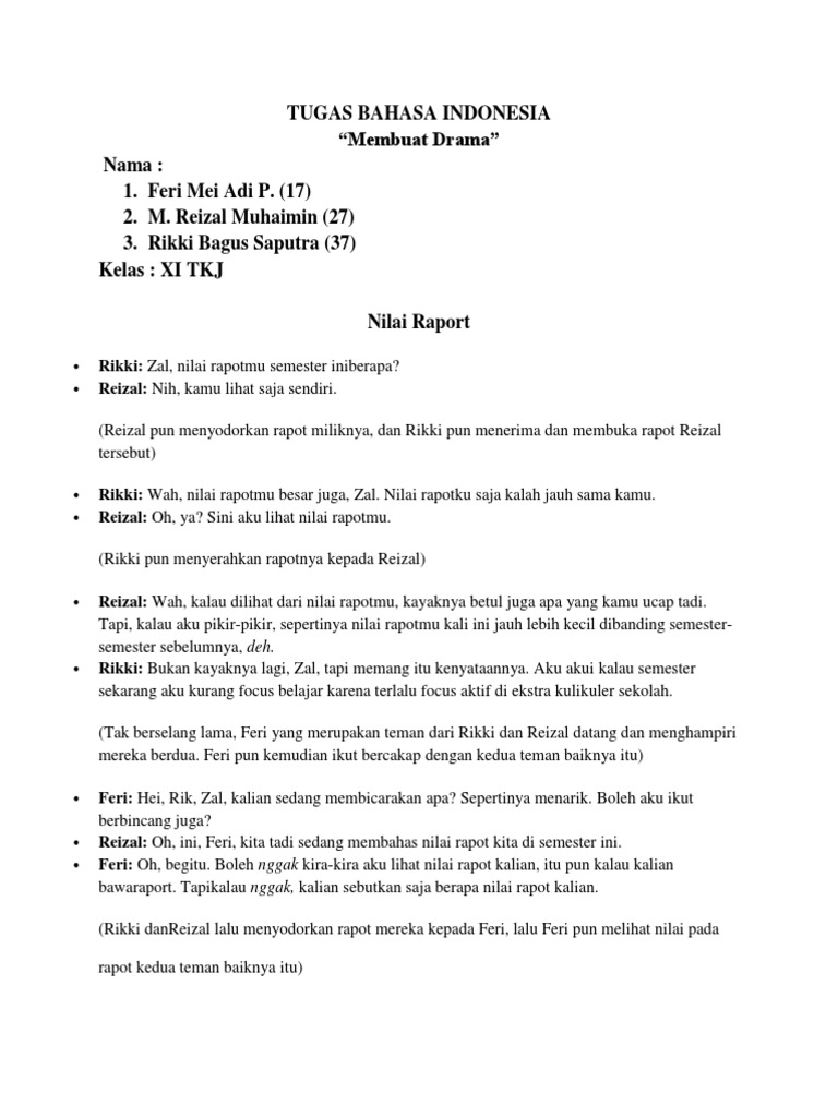 Percakapan yang berlangsung akan menyesuaikan dari jumlah orang yang ada pada dialog. Dialog biasanya dapat ditemukan dalam berbagai jenis jenis prosa fiksi seperti jenis jenis novel macam macam cerpen dan jenis jenis romanseperti yang disebutkan sebelumnya bahwa dialog dapat berisi perakapan dua orang atau lebih sehingga dialog pun bisa. Contoh drama komedi moho maaf contohnya tidak bisa admin berikan dengan bentuk video drama komedi karena segala keterbatasan admin contoh dramanya kami sajikan dengan skrip dialog antara 3 pemeran. 10 contoh percakapan singkat bahasa indonesia tentang pendidikan jual beli dan liburan dialog atau percakapan merupakan materi dasar yang harus dikuiasai oleh siswacontoh percakapan termasuk kedalam materi bahasa indonesia dan umum ditemui di kelas vii sekolah menengah pertama hingga kelas xi sekolah menengah atas. Contoh percakapan bahasa inggris 3 orang di restaurant beserta artinya. Langsung saja kita simak selengkapnya berikut ini.