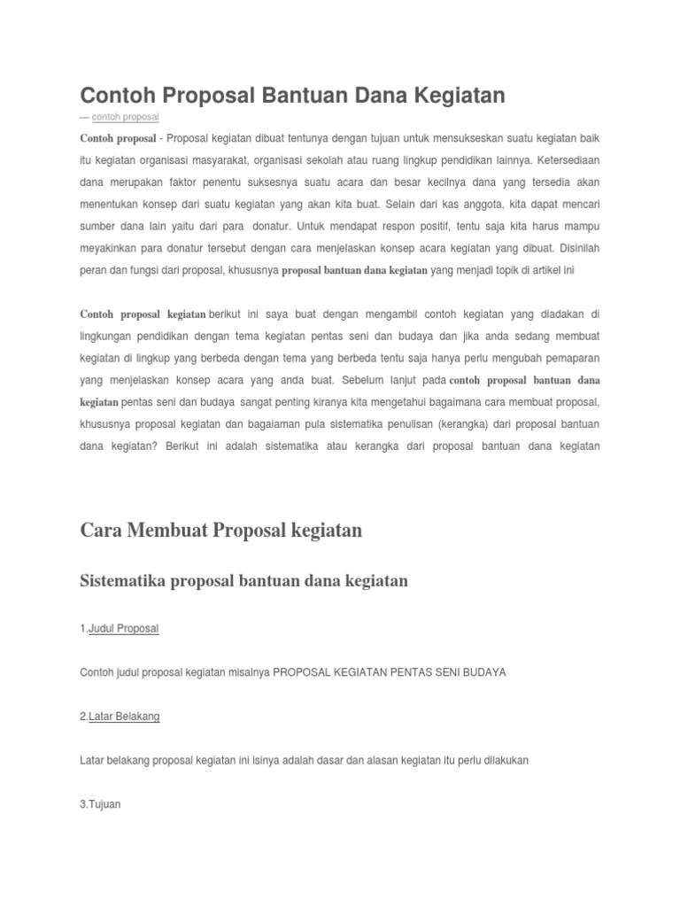 Assalamualaikum sobat rumuscoid kali ini akan memberikan materi tentang contoh proposal pengajuan kegiatan dana lengkap dengan struktur fungsi dan pengertiannya tujuan dan langkah supaya mudah di pahami. Contoh proposal permohonan bantuan dana untuk kegiatan a. Buku adalah jendela dunia kita sepakat soal itu. Untuk mendownload versi microsoft word silahkan download proposal kegiatan bemdoc setelah didownload jika diminta password maka masukkankata sandi pjv network untuk membuka file tersebut. Contoh proposal kegiatan bakti sosial proposal kegiatan bakti sosial ini merupakan proposal yang harus dibuat oleh kepanitian yang akan melangsungkan kegiatan bakti sosial. Proposal ini berguna untuk memandu pihak lain di luar kepanitiaan untuk mengkaji dan mengetahui bagaimana kegiatan tersebut akan dilaksanakan.