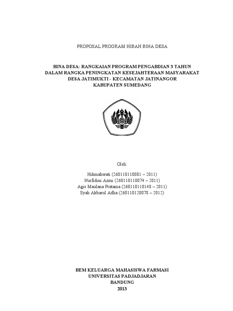 Contoh proposal program hibah bina desa. Demikian proposal bina desa ini kami susun. Bandung 24 juni 2013 menyetujui mengetahui. Budi sanjaya 51033410022010 erma suryani 41012300042010 rahman safii 51121210052011 sapnita idamarna daulay 41011310282010 unit kegiatan mahasiswa. Dalam pelaksanaan program hibah bina desa ini tentunya tim peneliti tidak dapat melaksanakannya sendiri pastinya tim peneliti membutuhkan kerja sama dengan pihak masyarakat desa sido rukun untuk mensukseskan kegiatan ini. Proposal program hibah bina desa mencetak generasi yang cerdas dan sholeh melalui rumah digital di desa muka paya dusun vi kecamatan hinai kabupaten langkat oleh. Peran aktif dan dukungan dari berbagai pihak sangat kami harapkan guna mewujudkan niat rencana dan usaha pelaksanaan bina desa yang insya allah dapat memberikan manfaat bagi kita semua.