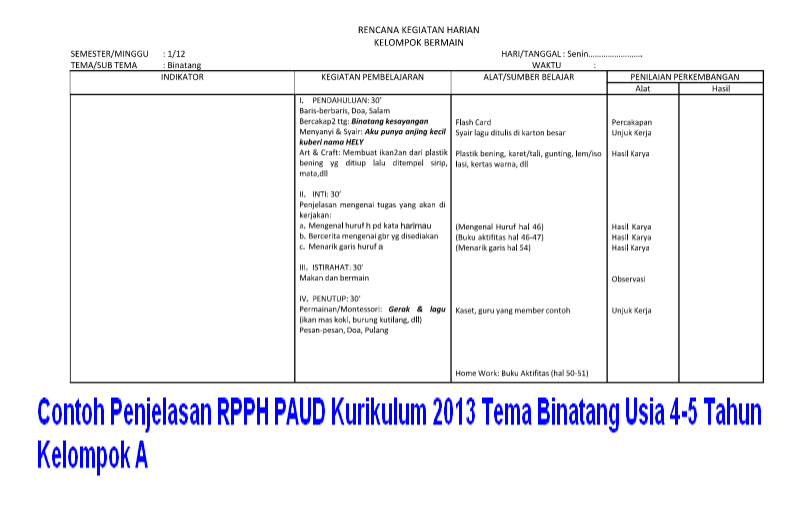 Contoh rpph paud tema binatang. Contoh rpph tk b smt 1 dapatkan rpph tk kelompok b semester 1 minggu 9 17 sesuai kurikulum 2013 paud melalui paud jateng ini. Adminsitrasi paud salah satu penunjang kelengkapan administrasi guru perangkat pembelajaran dikelas kali ini kami bagikan salah satunya yakni rpph rencana pelaksanaan pembelajaran harian dengan tema binatang sub tema binatang di air dan sub sub tema ikan yang termasuk dalam materi kurikulum 2013 k13 untuk digunakan di semester 1 kelompok a. Itulah penjelasan serta contoh rpph tema binatang usia 5 6 tahun semester 1 kurikulum 2013 semoga dapat bermanfaat bagi anda dalam membuat sendiri rpph sesuai dengan model pembelajaran yang diterapkan oleh masing masing guru di lembaga paudtk yang anda kelola. Yang bisa digunakan untuk melengkapi administarsi guru yang dapat di unduh secara gratis dengan menekan tombol download. Pada rpph kurikulum 2013 paud tema binatang yang admin sajikan ini dimana disusun dengan berdasarkan pada indikator materi yang terdapat dalam program mingguan terkait hal ini kamipun telah menyiapkan juga contoh rppm paud tema bintang yang pastinya akan diperlukan sebagai acuan untuk mengembangkan pelaksanaan kegiatan harian. Rkh juga disebut dengan rpph rencana pelaksanaan pembelajaran harian yang disusun berdasarkan rkm yang berisi kegiatan.