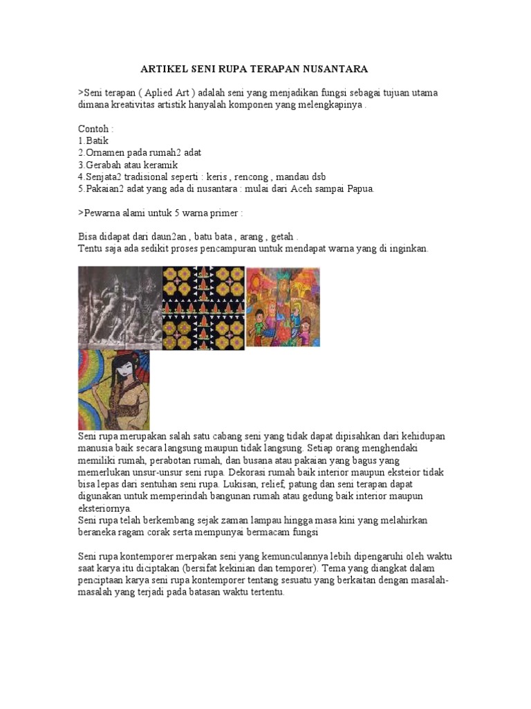 Contoh seni rupa terapan nusantara. Seni rupa dilihat dari fungsinya dibedakan antara seni rupa murni dan terapan proses penciptaan seni rupa murni lebih condong pada ekspresi jiwa semata misal lukisan sedangkan dengan seni rupa terapan proses pembautannya mempunyai tujuan dan fungsi tertentu misalnya seni kriya. Karya seni rupa terapan tiga dimensi trimatra adalah suatu karya seni rupa yang dilihat dari segala arah dan memiliki ruang atau volume. Seni rupa terapan nusantara adalah karya seni asli nusantara atau indonesia yang dapat digunakan untuk memenuhi kebutuhan praktis. 10 contoh karya seni terapan nusantara luasnya wilayah serta daerah yang berbentuk kepulauan membuat nusantara atau indonesia memiliki beragam karya seni rupa terapan. Contoh karya seni rupa tiga dimensi adalah patung rumah adat senjata tradisional misalnya seperti rencong dan pedang. Seni rupa terapan adalah karya seni rupa yang digunakan dalam kehidupan sehari hari karena mengandung nilai fungsi tertentu di samping nilai seni yang dimilikinya.