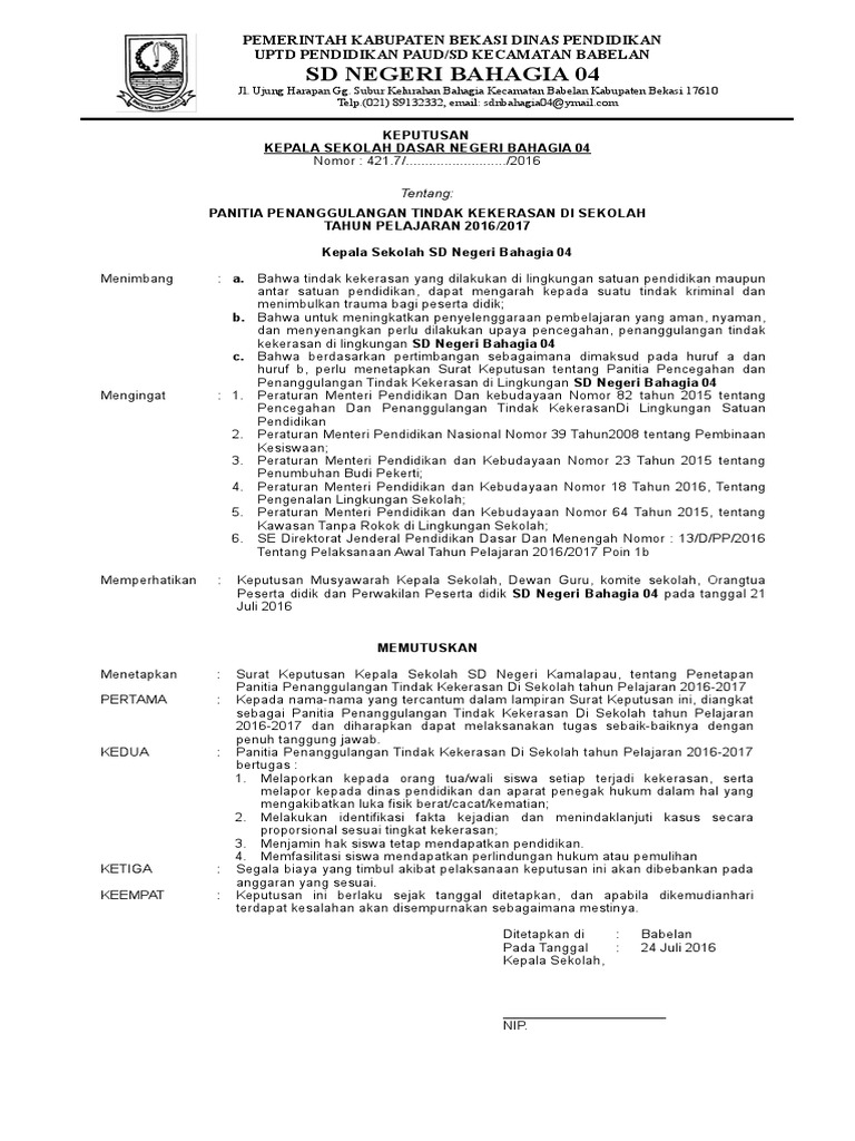 Contoh sk sekolah aman penanggulangan tindak kekerasan sd smp sma smk ini merupakan salah satu contoh surat keputusan kepala sekolah yang akan saya bagikan dalam kesempatan kali ini. Prinsip prinsip sekolah aman dapat dilihat dari beberapa indikator seperti warganya bebas rasa takut dari segala ancaman keamanan sekolah memiliki komitmen terhadap budaya aman suasana kondusif untuk belajar hubungan antar warga sekolah positif sadar terhadap resiko. Program penanggulangan tindak kekerasan atau populer disebut sekolah aman merupakan program terbaru sebagai tindakan preventif pemerintah disekolah.