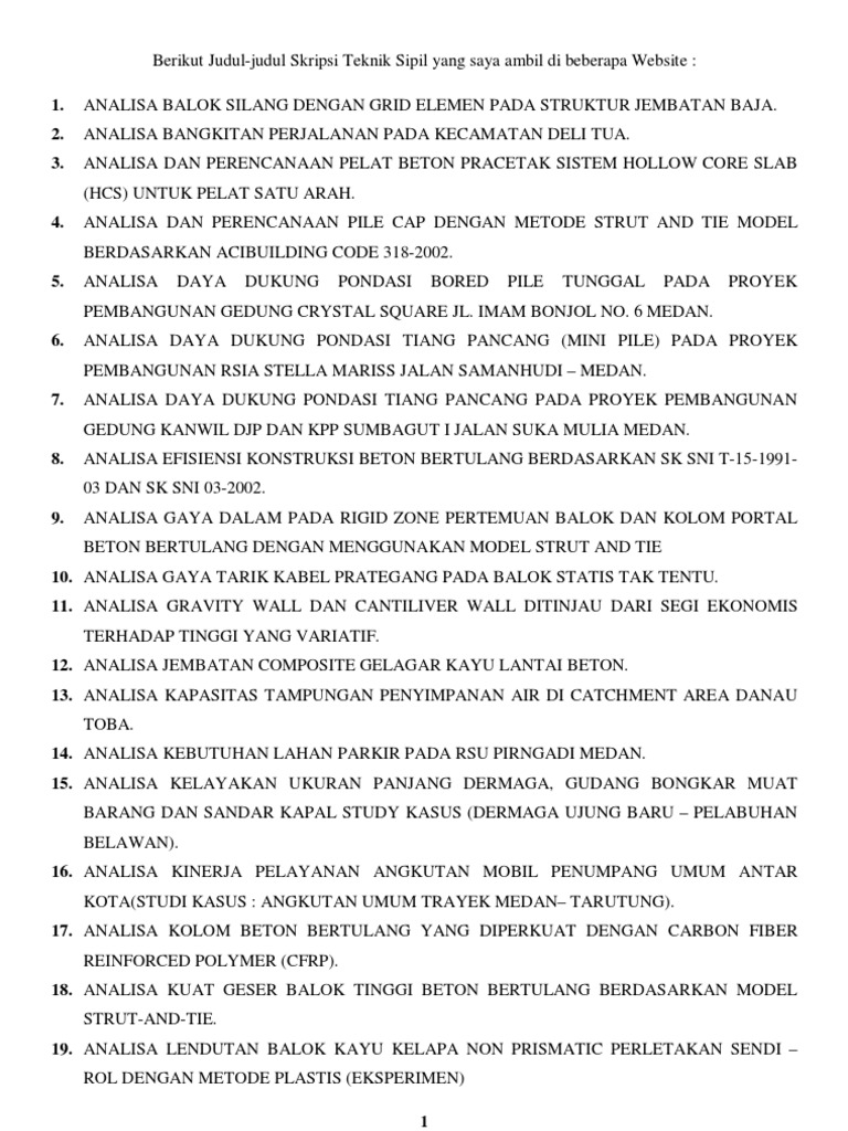 Oleh karenanya mahasiswa butuh referensi judul dan contoh skripsi lengkap untuk dijadikan penelitian terdahulu. Zzinilah skripsi teknik sipil pdf terbaru lengkap untuk temen temen semua para mahasiswa jurusan teknik sipil yang mungkin pada saat ini membutuhkan skripsi referensi yang lengkap dan terbaru. Penulisan skripsi ini dimaksudkan untuk melengkapi persyaratan kurikulum dalam rangka menyelesaikan studi guna memperoleh gelar sarjana teknik pada jurusan teknik sipil universitas negeri semarang. Untuk mendapatkan daftar lengkap contoh skripsi teknik lengkap tesis teknik lengkap dalam format pdf ms word dan hardcopy silahkan memilih salah satu link yang tersedia berikut.