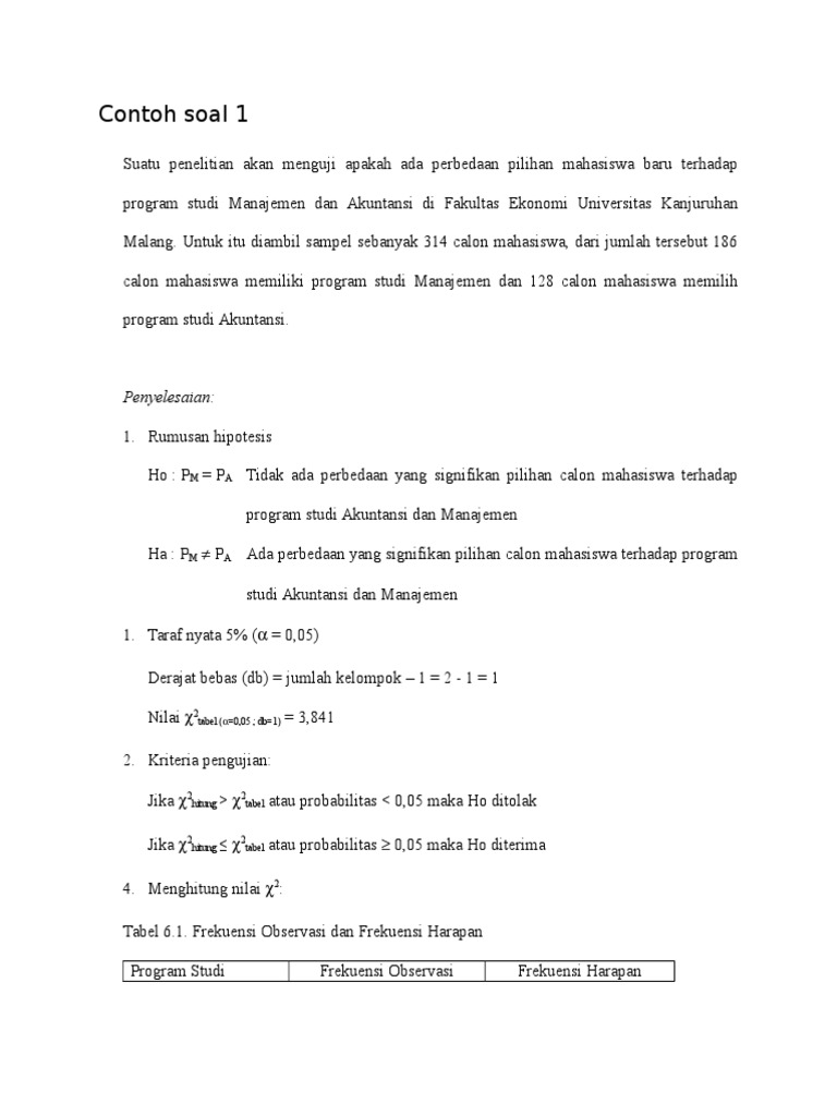 Contoh soal chi square. Apabila chi square hitung chi square tabel maka perbedaan bersifat signifikan artinya h0 ditolak atau h1 diterima. Analisis chi square contoh kasus. Uji chi square adalah salah satu statistik uji yang dapat digunakan untuk menguji apakah frekuensi yang diamati cukup mendekati frekuensi yang diharapkan sehingga mempunyai kemungkinan besar untuk terjadi di bawah h0. Regresi contoh soal dan soal. Pada contoh di atas baris ada 3 dan kolom ada 2 sehingga df 2 1 x 3 1 2. Df pada contoh di atas adalah 2.