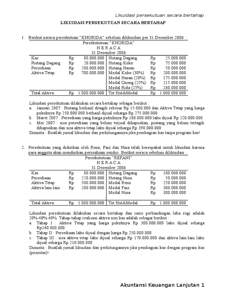 Contoh soal dan jawaban akuntansi keuangan lanjutan 1 persekutuan. Contoh soal contoh soal 1. Didalam persekutuan pemisahan pemilik dan manajemen hampir. Bentuk persekutuan dimana semua anggotanya dapat bertindak atas nama perusahaan dan kepadanya dapat diminta pertanggung jawaban atas kewajiban kewajiban persekutuan. Akuntansi lanjutan 1 sabtu 28 januari 2012. Yang mengadakan persekutuan itu ada dan masing masing masih tetap menghendakinya. Contoh file soal uts lengkap kelas 1 6 sdmi semua mata pelajaran 20162017 berikut ini adalah kumpulan dari berbagi sumber tentang contoh soal akuntansi keuangan lanjutan 2 dan jawabannya yang bisa gunakan untuk bank soaldownloadsd dan diunduh secara gratis dengan menekan tombol download biru dibawah ini.