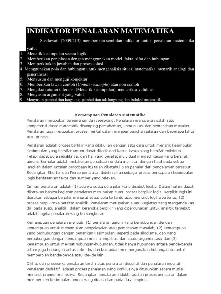 Penalaran matematika meliputi mengumpulkan bukti bukti membuat konjektur konjektur menetapkan generalisasi generalisasi membangun argumen argumen dan menentukan dan validasi kesimpulan kesimpulan logis berdasar ide ide dan hubungan hubungannya. Ada dua cara penyelesaian siswa yaitu dengan menggunakan konsep limit yang dihafalkan atau menggunakan rumus turunan. Penalaran diartikan sebagai penarikan kesimpulan dalam sebuah argumen dan cara berfikir yang merupakan penjelasan dalam upaya memperhatikan hubungan antara dua hal atau lebih berdasarkan sifat sifat atau hukum hukum tertentu yang diakui kebenarannya dengan. Kemampuan penalaran matematik sangat penting dimiliki siswa untuk meningkatkan pemahaman siswa terhadap kegunaan matematika itu sendiri. Contoh soal psikotes matematika beserta jawabannya.
