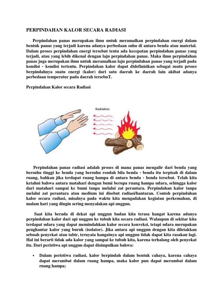 Pengertian perpindahan kalor secara radiasi dan contohnya. Di antara bumi dan matahari terdapat ruang hampa atau hampir hampa sehingga kalor yang datang dari matahari bersuhu lebih tinggi ke bumi bersuhu lebih rendah tidak mungkin melalui perantaraan materi. Pengertian dan contoh konduksi konveksi radiasi perpindahan kalor secara alamiah kalor berpindah dari benda yang memiliki suhu lebih tinggi ke benda yang memiliki suhu yang lebih rendahperpindahan kalor ada tiga macam cara yaitu konduksi konveksi dan juga radiasi. Sebuah lampu pijar memakai kawat wolfram dengan luas a 10 6 m 2 dan emisivitasnya e 05. May 21 2017 admin leave a comment. Materi contoh soal dan pembahasan.