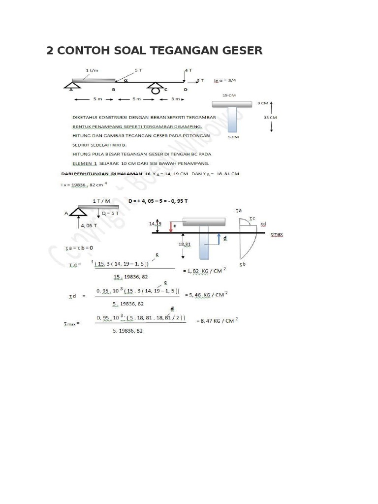 Contoh soal tegangan geser. Sebuah sambungan terlihat seperti gambar jika p 30 kn carilah tegangan geser yang terjadi pada a a. Tegangan normal dan tegangan geser. Contoh soal dan pembahasan tegangan normal akibat beban aksial 1. Tegangan normal dan tegangan geser 1 i. Taksirlah kapasitas yang dibawakan oleh momen puntir dari kopling baja yang ditempa secara terpadu pada poros yang terlihat dalam gambar yang dikendalikan oleh tegangan geser izin 40000 knm2 pada delapan baut. Tegangan total dan tegangan efektif dengan cara menggambarkan lingkaran mohr dan titik titik tegangan pada koordinat p q.